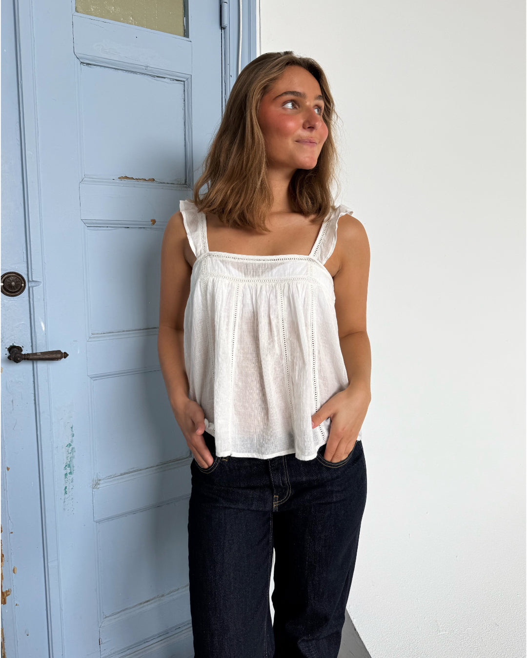 Modelfoto af pige som bærer en Amona top i hvid, samt et par mørkeblå jeans. Alt fra By Sofie Sønderby