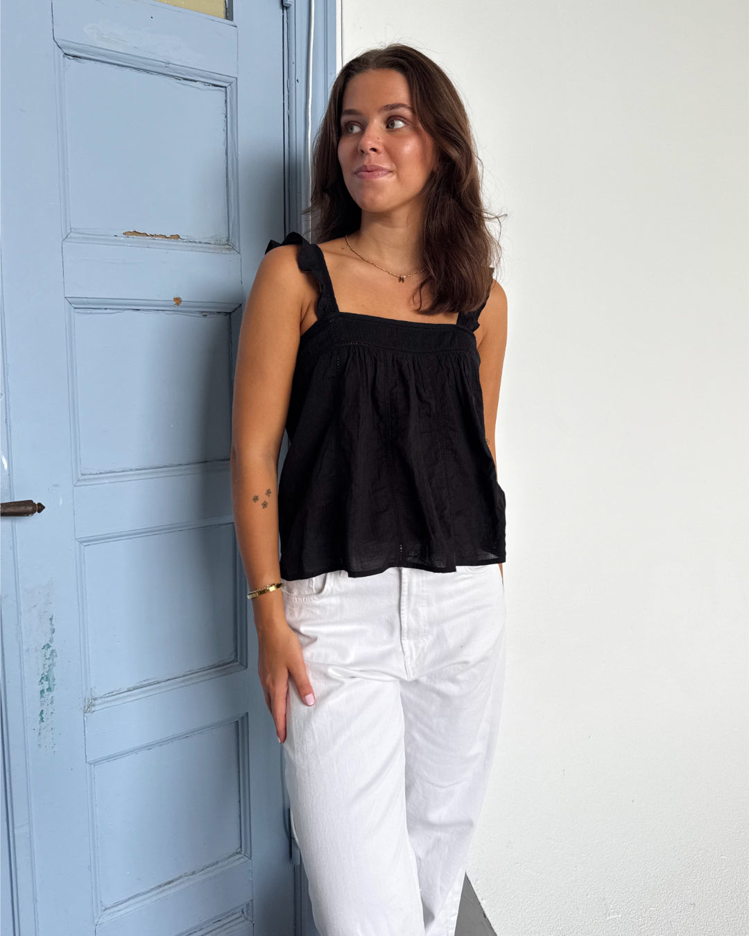 Den mycket fina AMONA toppen, svart är en fin och detaljerad topp, i sött broderat material. Toppen har fina breda band, som kan justeras i längden.