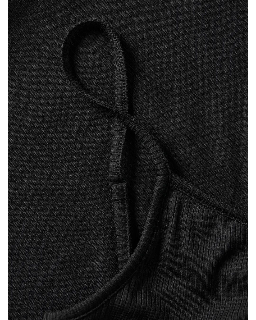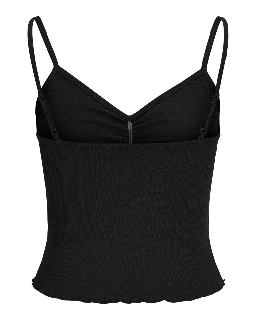 En sort, ribbet spaghettitop med justerbare stropper. Toppen har en tætsiddende pasform og en let bølget kant forneden, uden yderligere omgivelser.