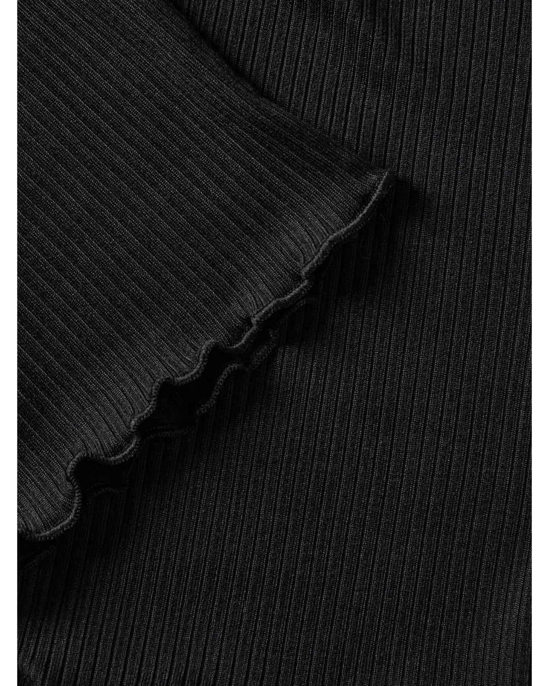 Sort, ribstrikket stof med bølget kant falder over anden flade. Teksturen er tydelig og giver et struktureret udseende i et enkelt og elegant mønstret design.