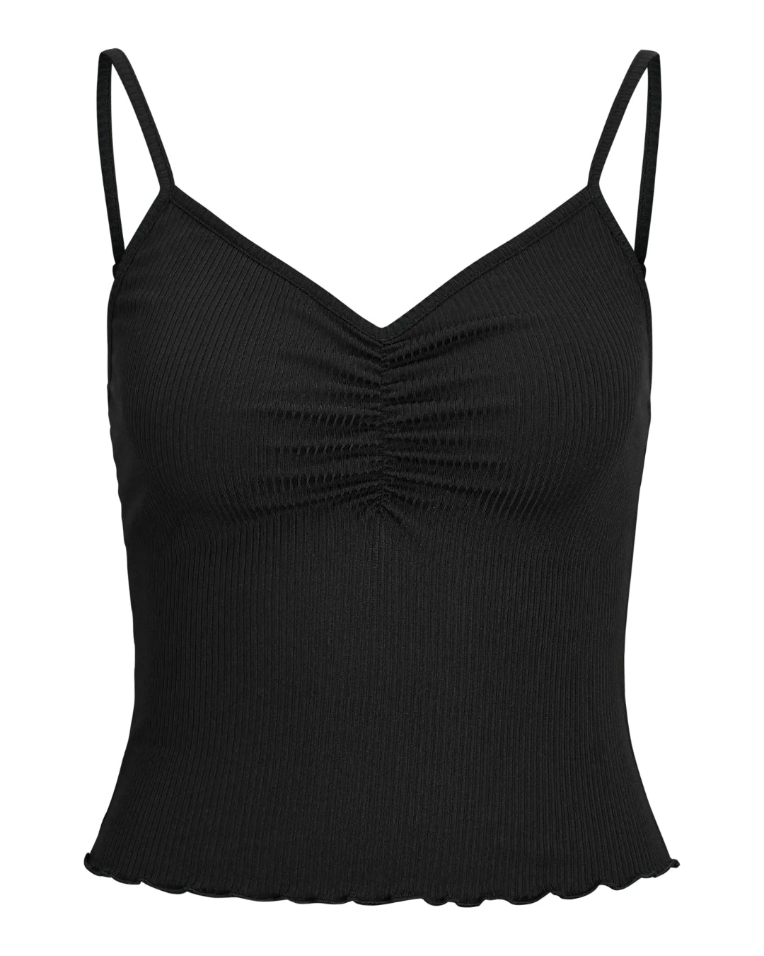 Sort ribbet top med tynde stropper og rynket detalje foran; præsenteret mod en hvid baggrund.