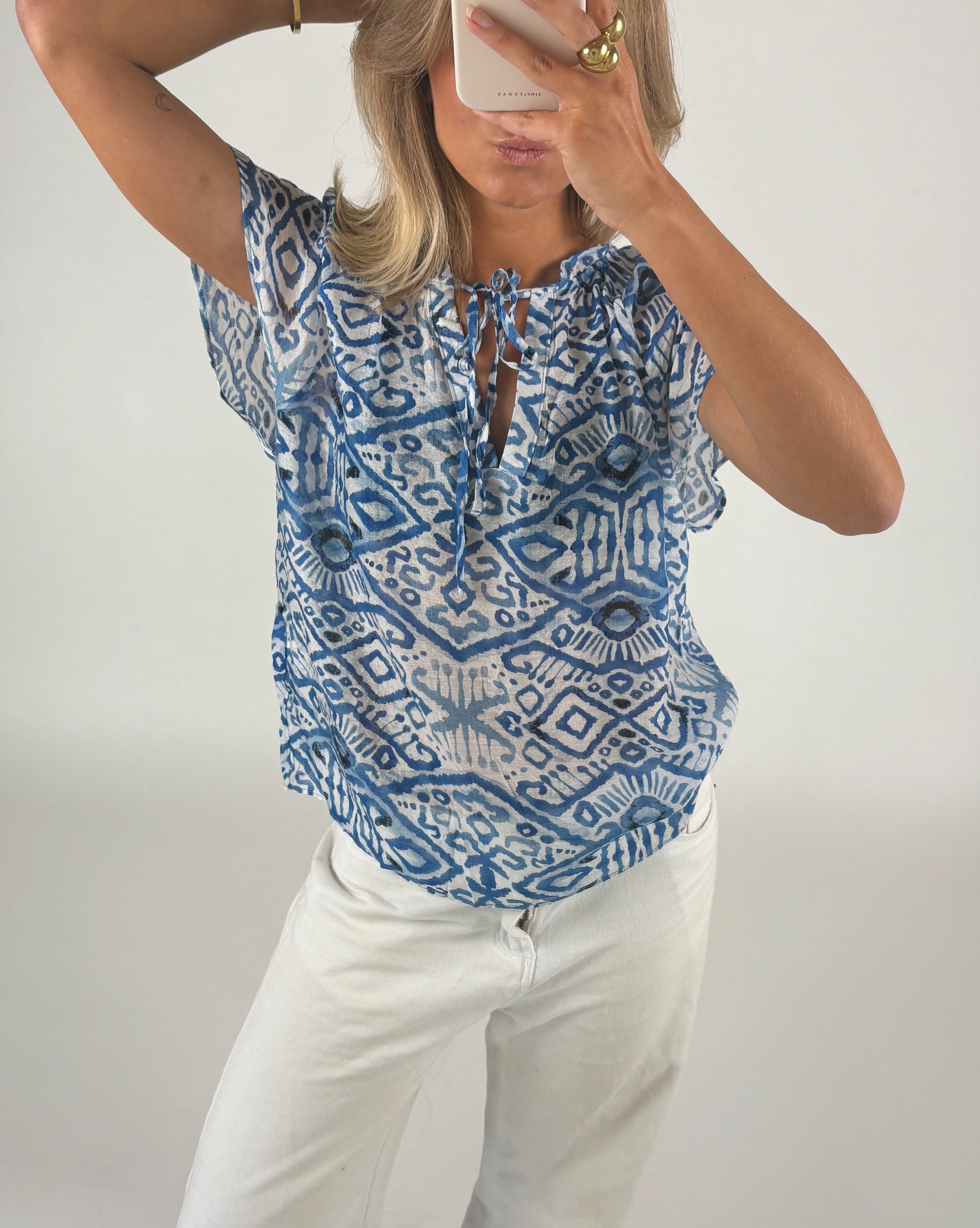HAZEL toppen, blå har ett fint mönstrat utseende och en liten elegant v-ringning med bindband.