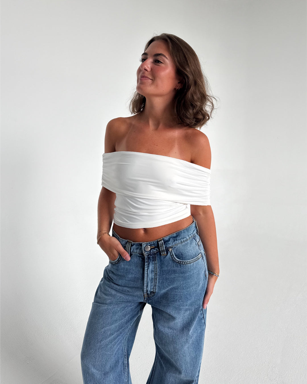Vår LEIA off shoulder top, vit är den smartaste toppen med det finaste off shoulder utseendet. Toppen är gjord i det läckraste stretchiga materialet.