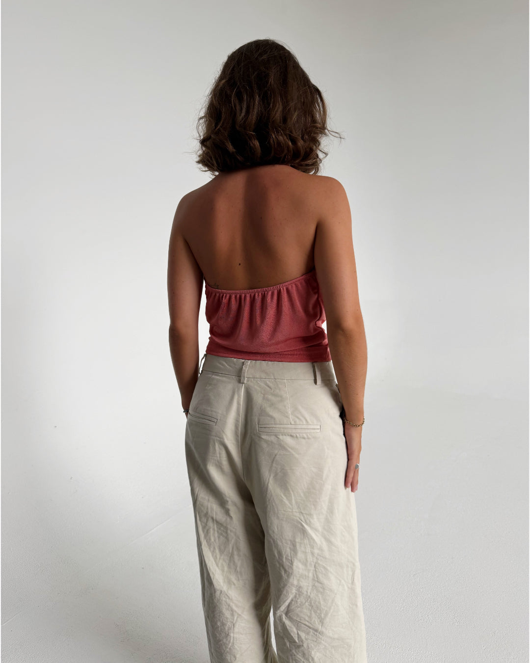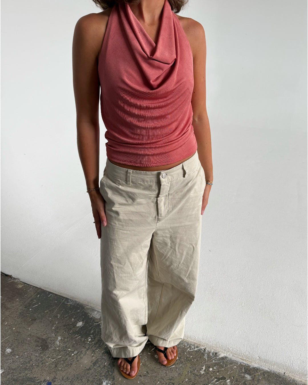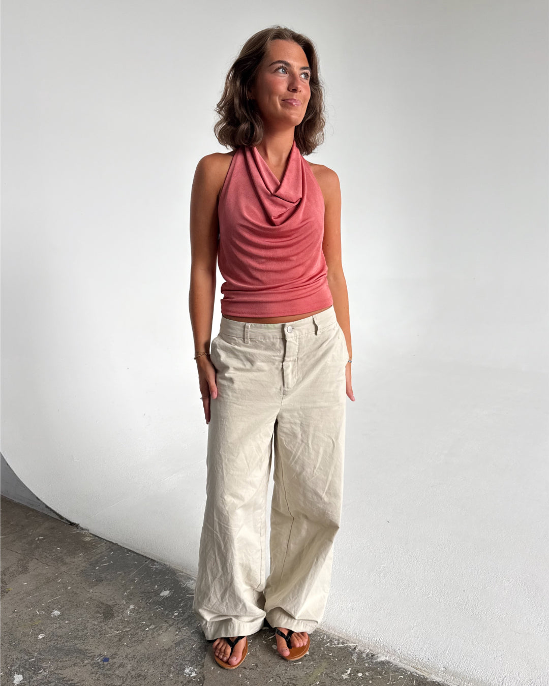 Modelfoto af pige der bærer Mavis top i Coral, samt Elanor bukser. Alt fra BySofieSønderby