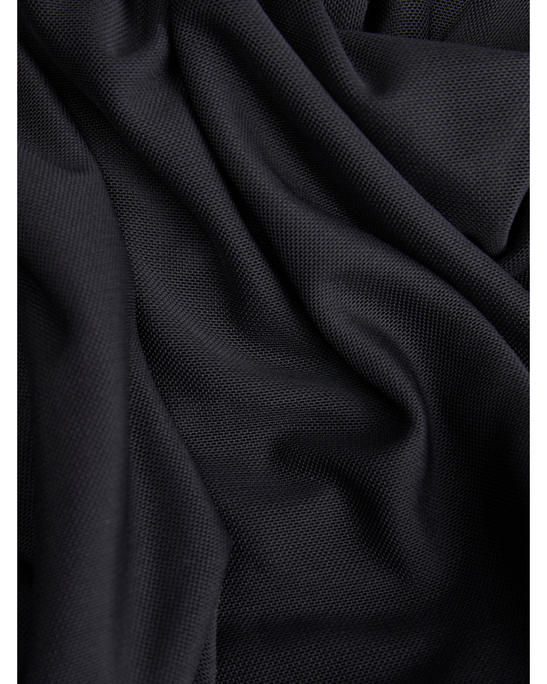 Sort stof ligger i bølgerede folder, hvilket skaber en blød, struktureret overflade. Stoffet har en let tekstueret vævning, der fremhæver materialets dybde i et enkelt miljø.