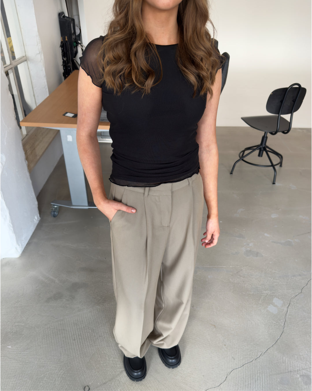 Kvinden står afslappet iført en sort t-shirt og beige bukser. Hun har én hånd i lommen og befinder sig i et minimalistisk, hvidt rum.