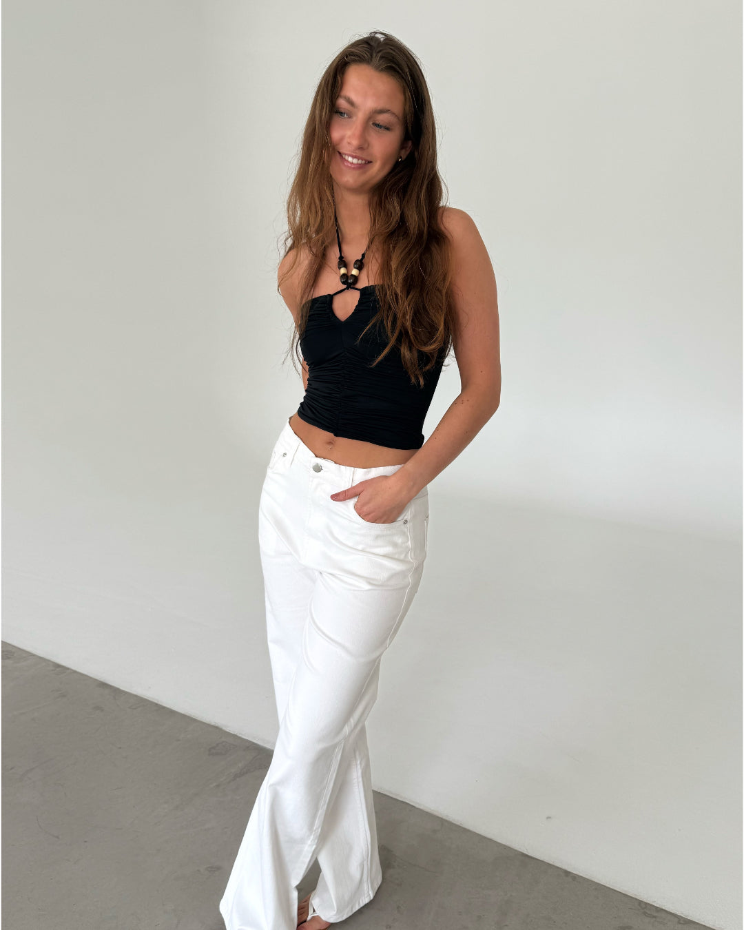 PERLE topp, svart är en vacker topp som sitter fint på kroppen. Toppen har bindeband i nacken med pärlor på. Denna topp är ett måste och är perfekt för de varmare sommardagarna.