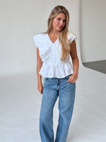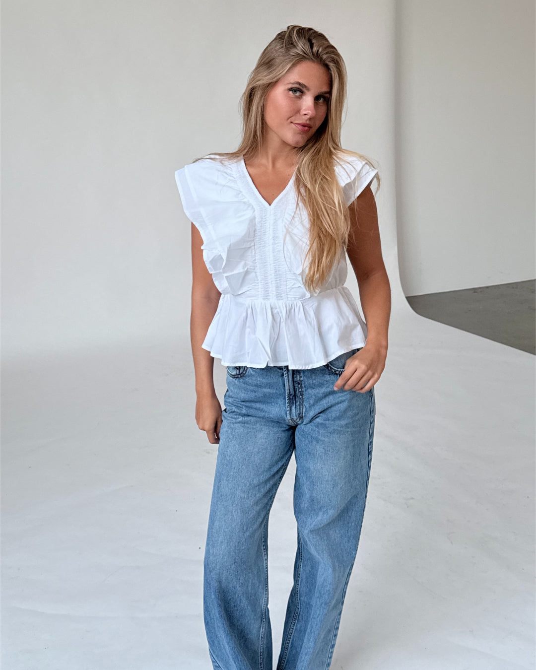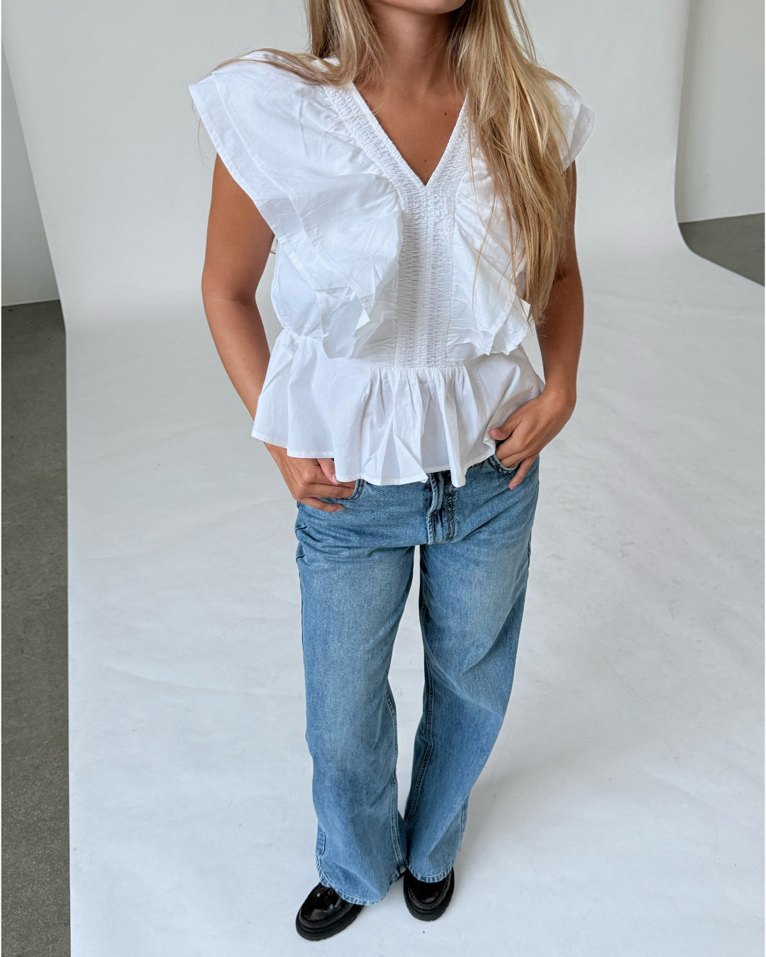 Vår RIKKE topp, vit är den vackraste toppen med de vackraste volangdetaljerna. Toppen är en del av vår SØNDERBY kollektion.