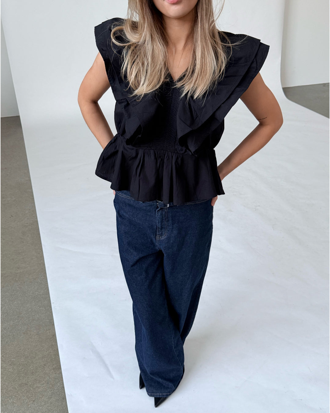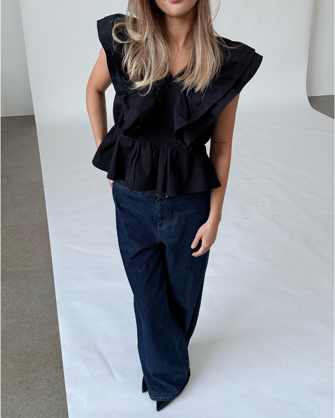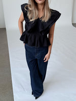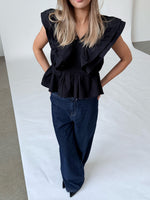 Vår RIKKE topp, svart är den vackraste toppen med de vackraste volangdetaljerna. Toppen är en del av vår SØNDERBY kollektion.