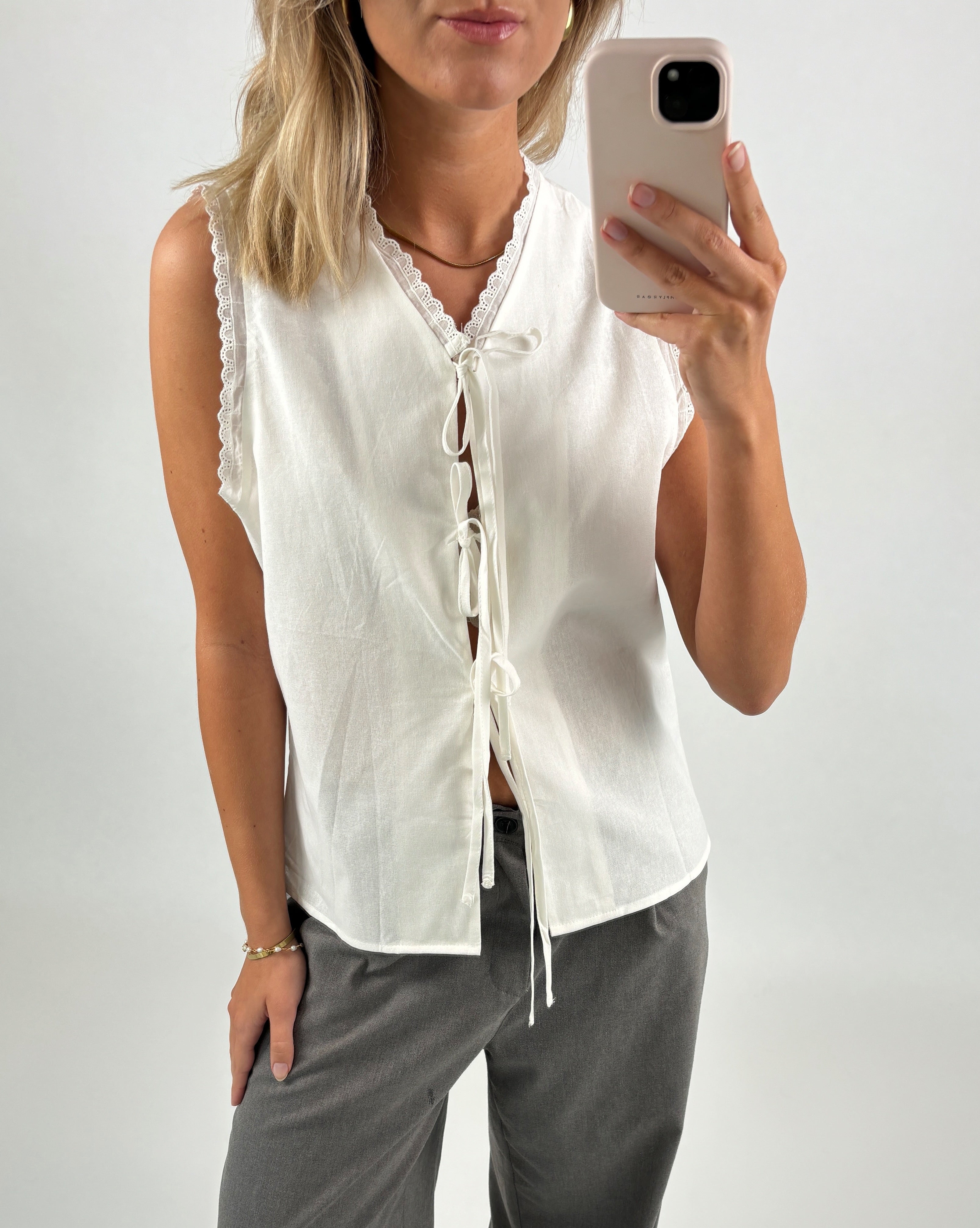 Den vackra VANILLA toppen, vit är en vacker topp med fina detaljer. Toppen stängs med hjälp av bindebandet fram, som kan knytas till 3 söta rosetter.