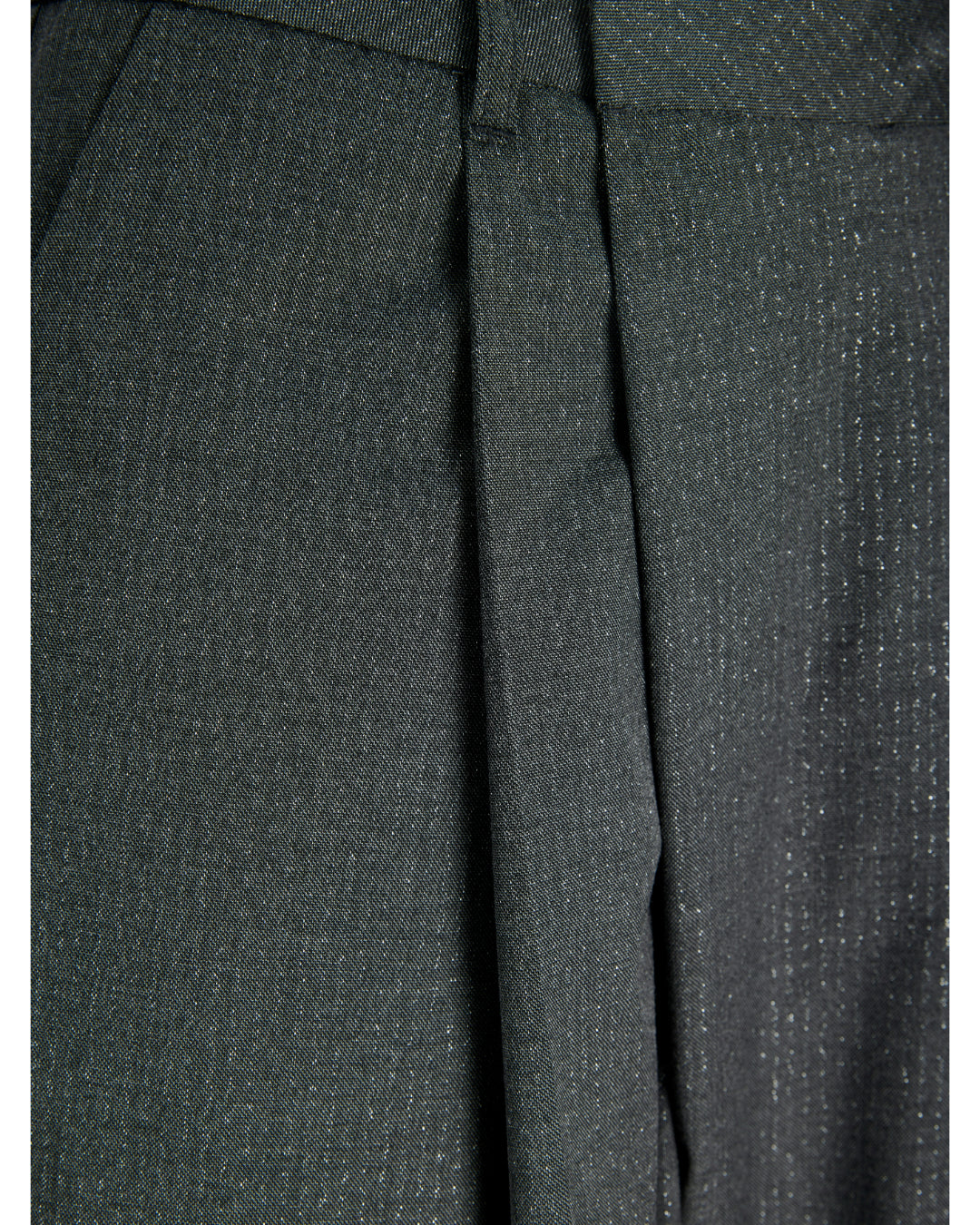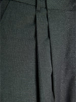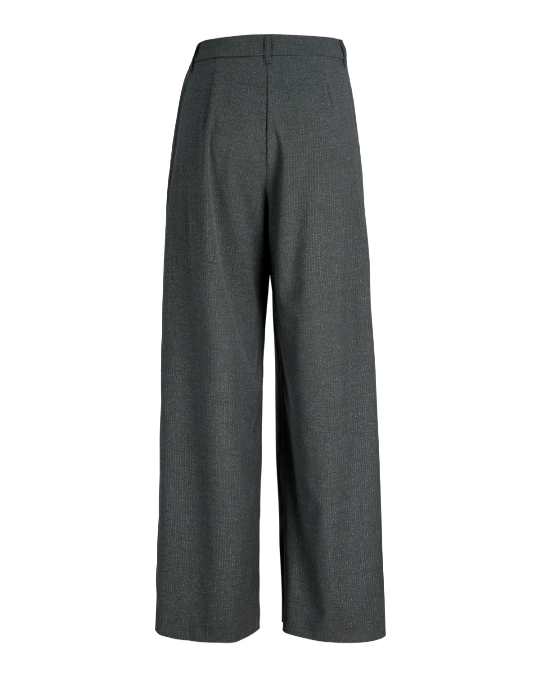 JOANNE byxor, grå har två fickor fram och en helt tunn silverrand i tyget.