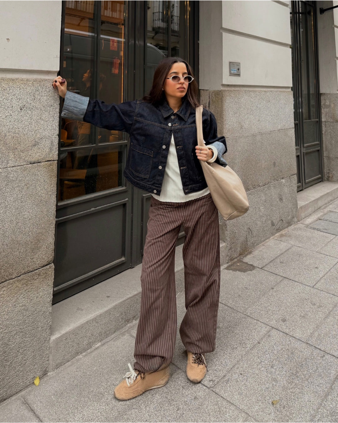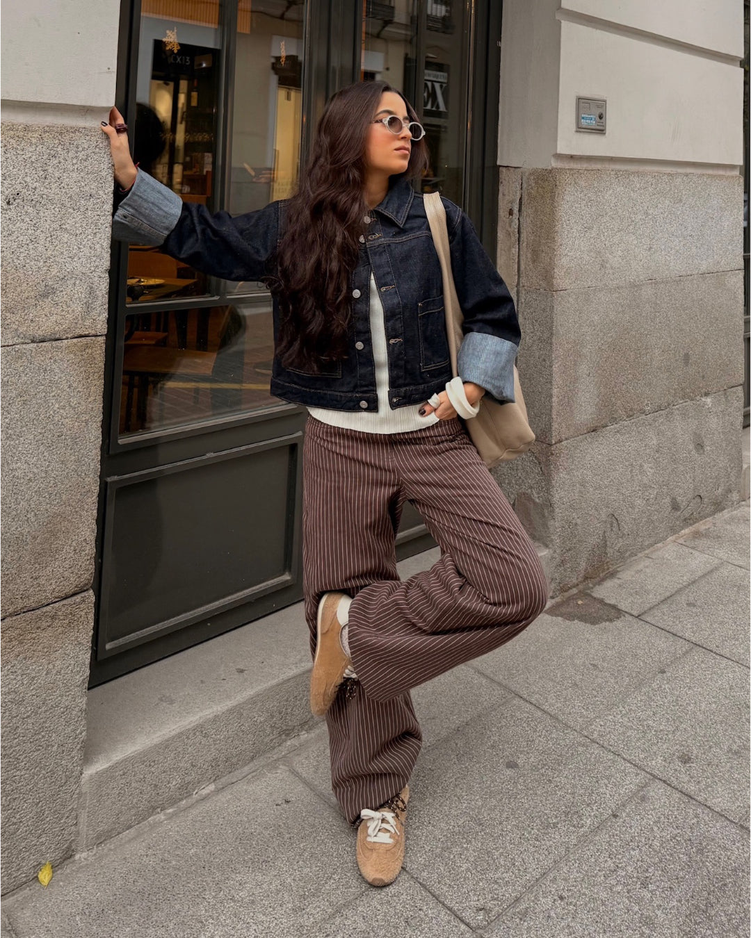 MADDY byxor, brun/ljusrosa är de coolaste pinstripe byxorna, designade i ett slitstarkt material.