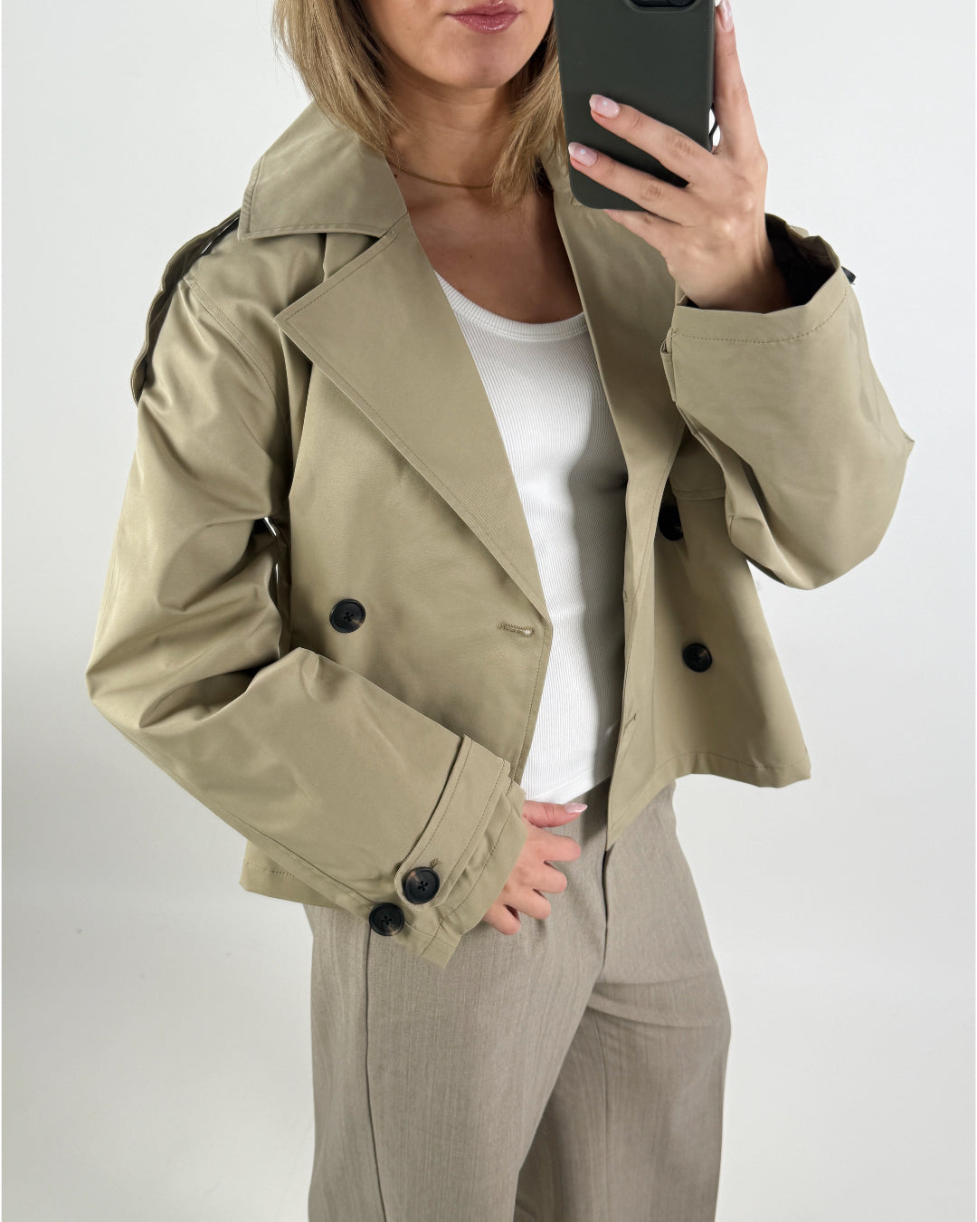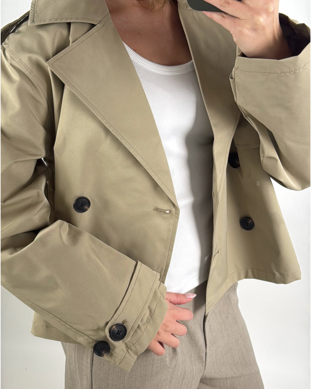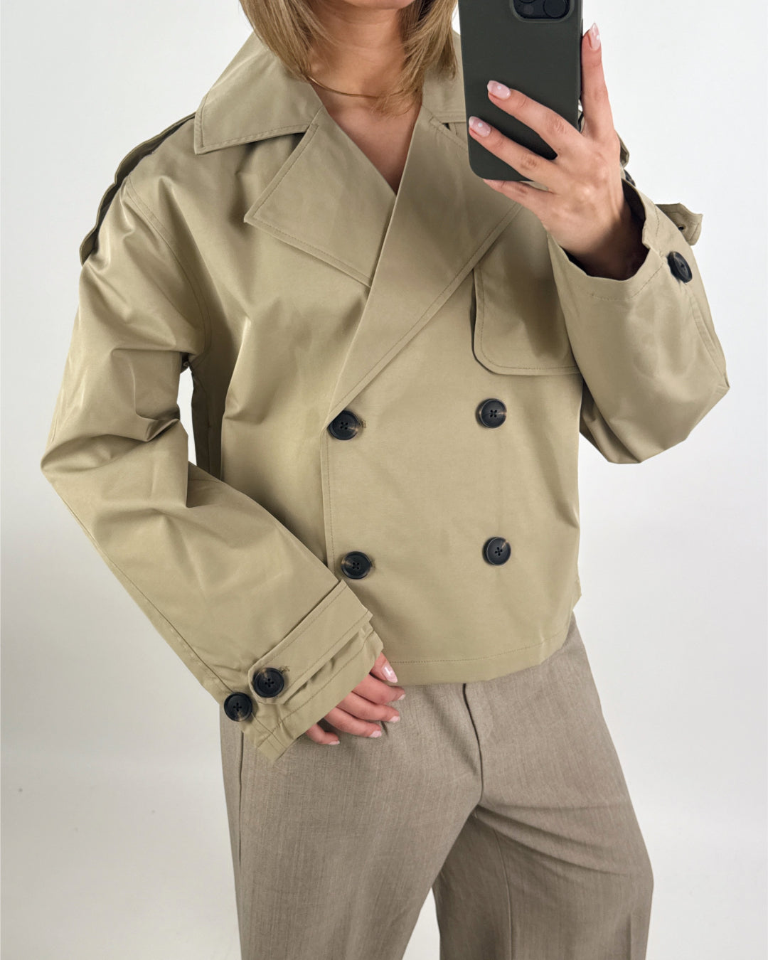 Den korta, boxiga passformen ger ett fräscht och nutida uttryck, medan justerbara remmar vid ärmarna tillför extra kant. Stilen är enkel och tidlös, vilket gör denna trenchcoat lätt att styla över allt från jeans till klänningar eller affärsoutfits.