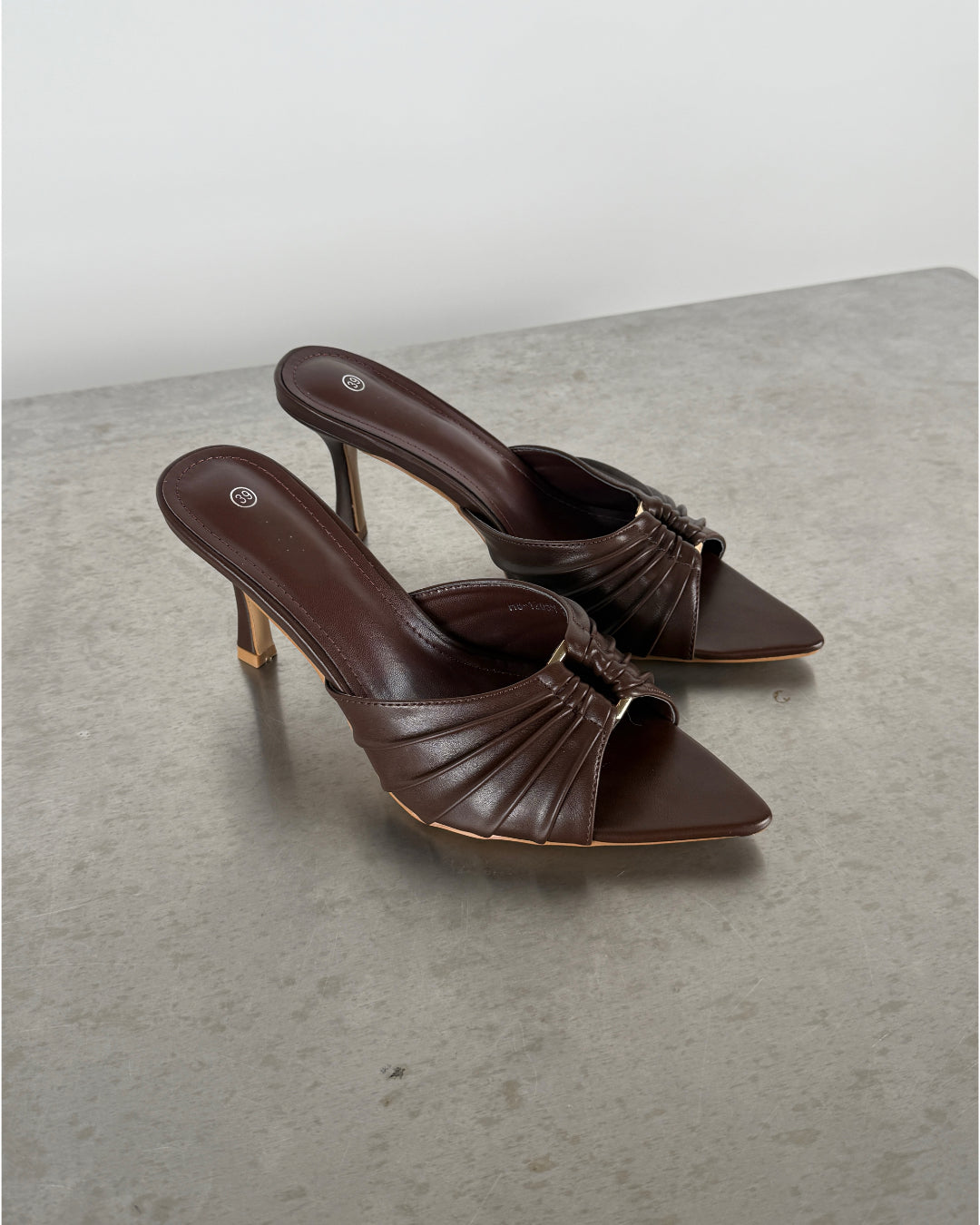 SELMA häl, brun har många fina detaljer som ger den ett vackert utseende. Den är utsmyckad med en liten guldfärgad ring ovanpå skon, som är en del av den fina rynkeffekten. Skon är spetsig och är öppen vid spetsen, vilket ger ett både unikt och feminint utseende.