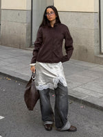 Modelfoto af pige i brun Allie ruskinds jakke og beigefarvede Arianna jeans. Alt er fra BySofieSønderby