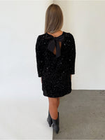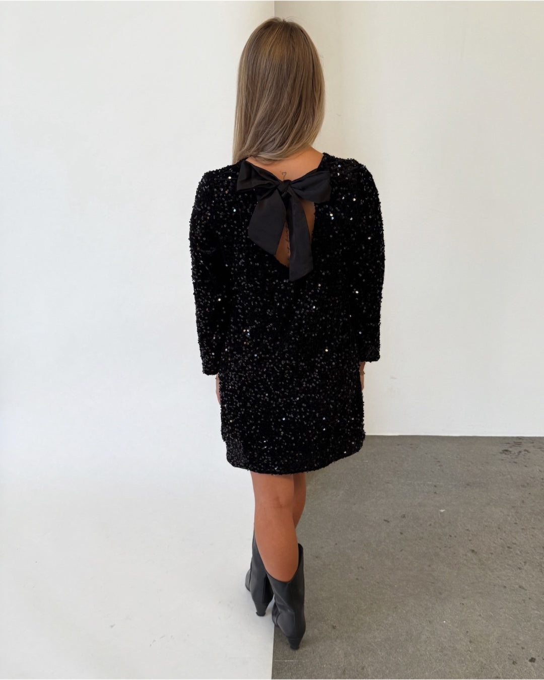 Vores smukke STEPHANIE kjole, sort er en kort paillet kjole. Kjolen har en indbygget underkjole, samt en dyb udskæring i ryggen med en stor og flot sløjfe.