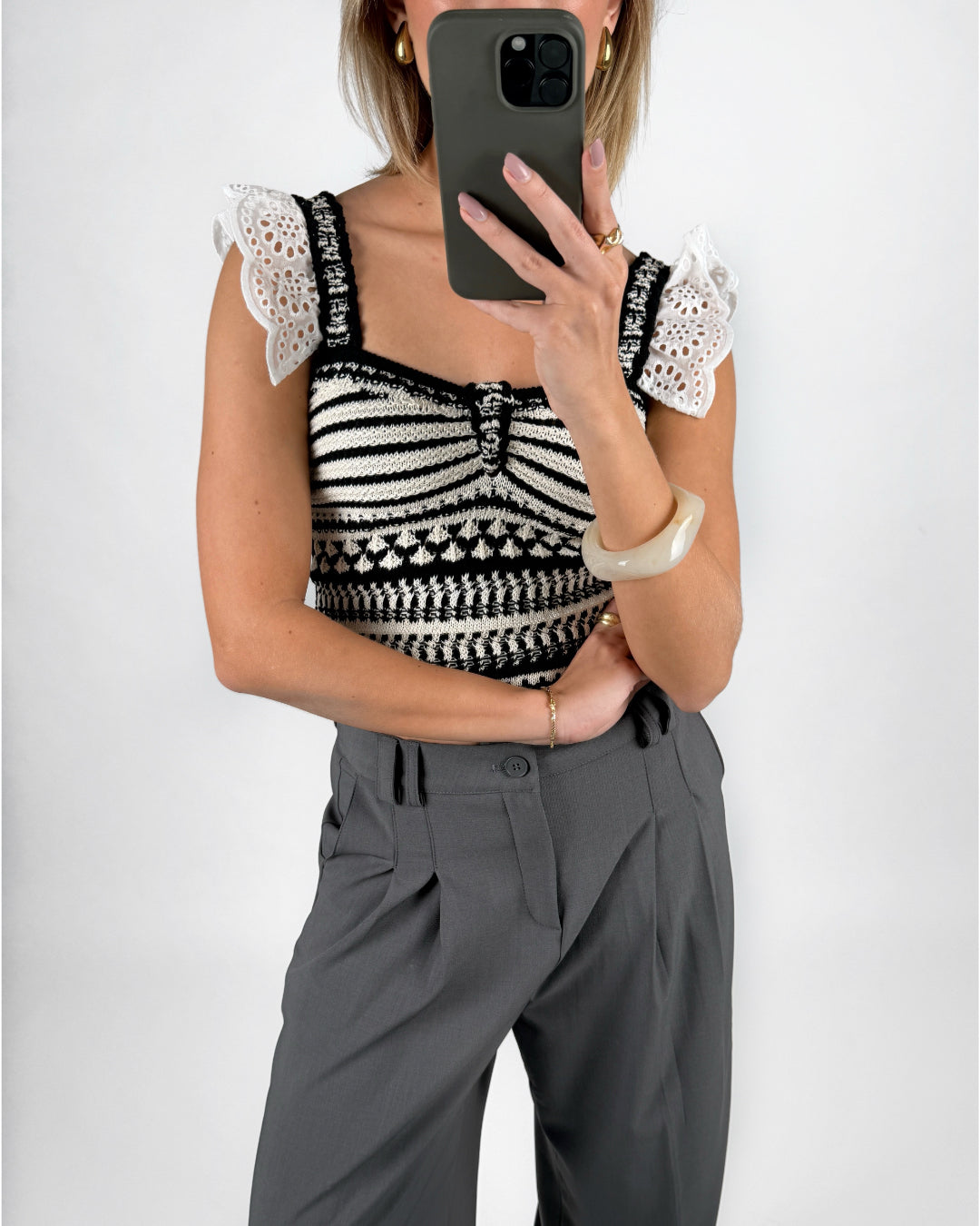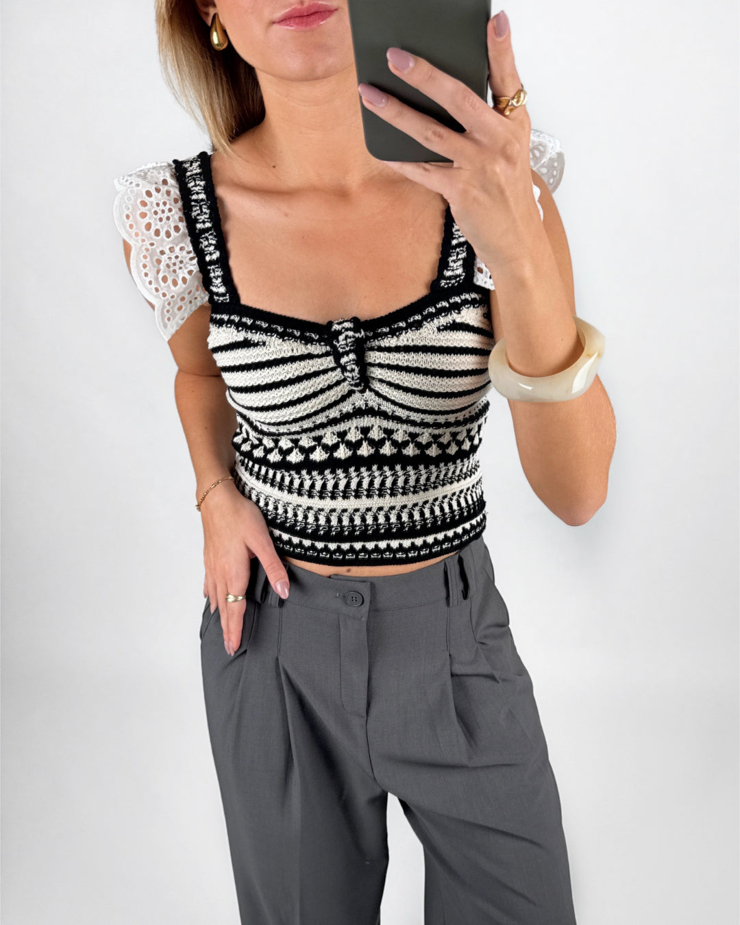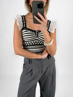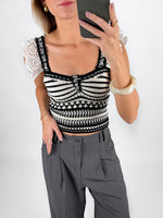 Den smukke KENDRA strik top, hvid/sort er en fin top, med en masse detaljer på. Toppen er i et hæklet look og har et blonde stykke på ærmet.