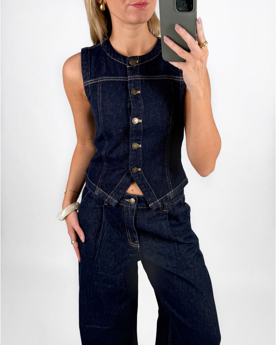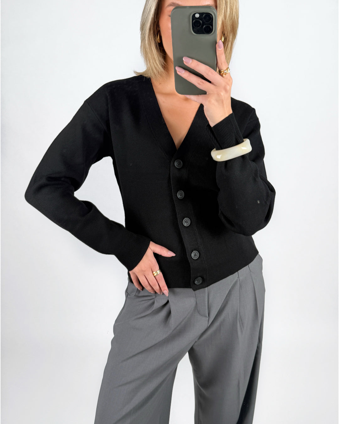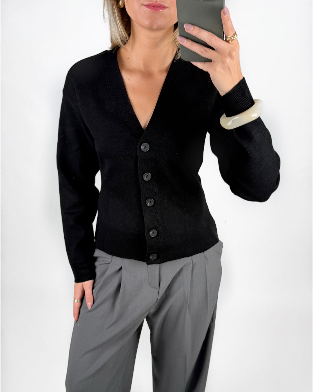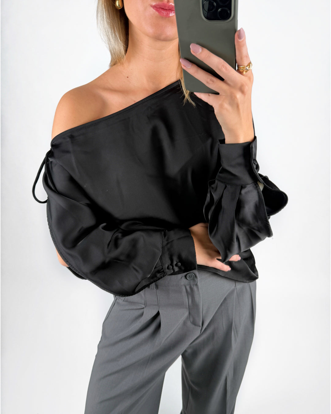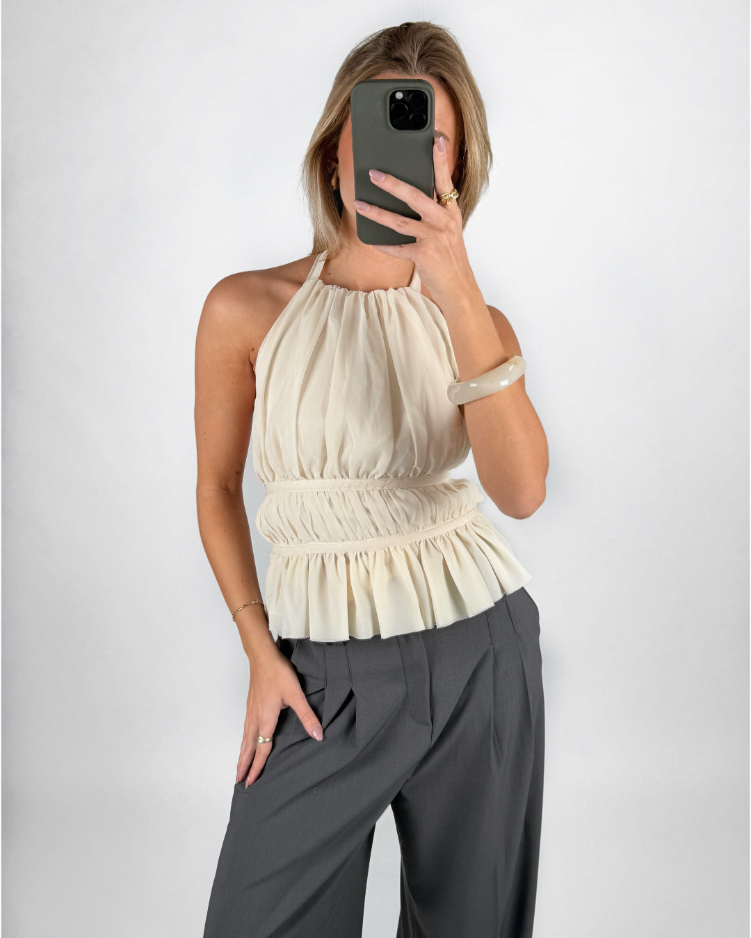 Modelfoto af pige med FANNY top, sort og NANNA bukser, hvid - begge fra fra BySofieSønderby