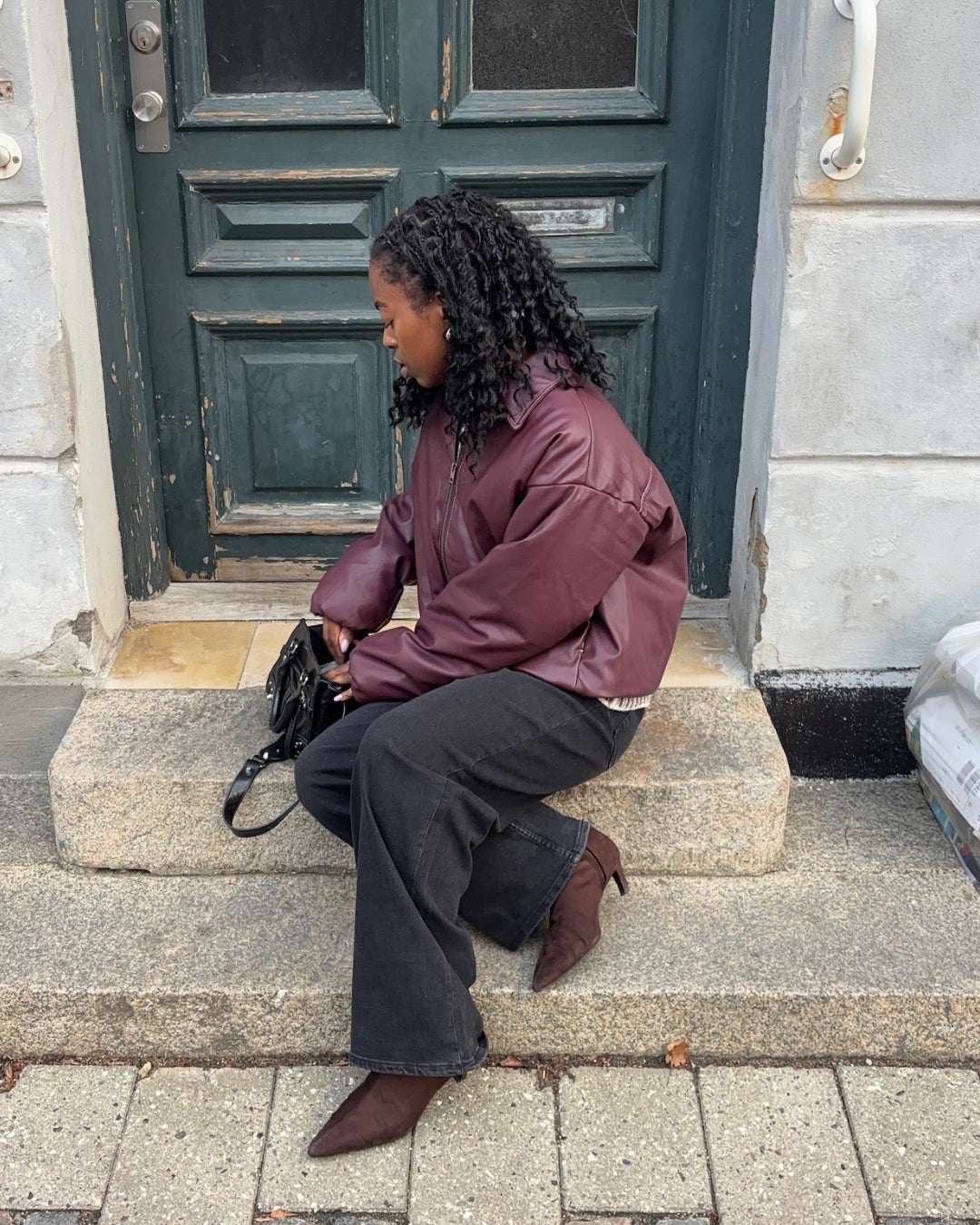 Den smukkeste PU jakke er landet på shoppen. CALA jakke, bordeaux har bomberjakke look, i det smukkeste materiale.