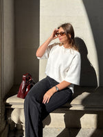 Modelfoto af pige der bærer Reynard strik t-shirt i hvid, samt grå bukser. Alt fra BySofieSønderby