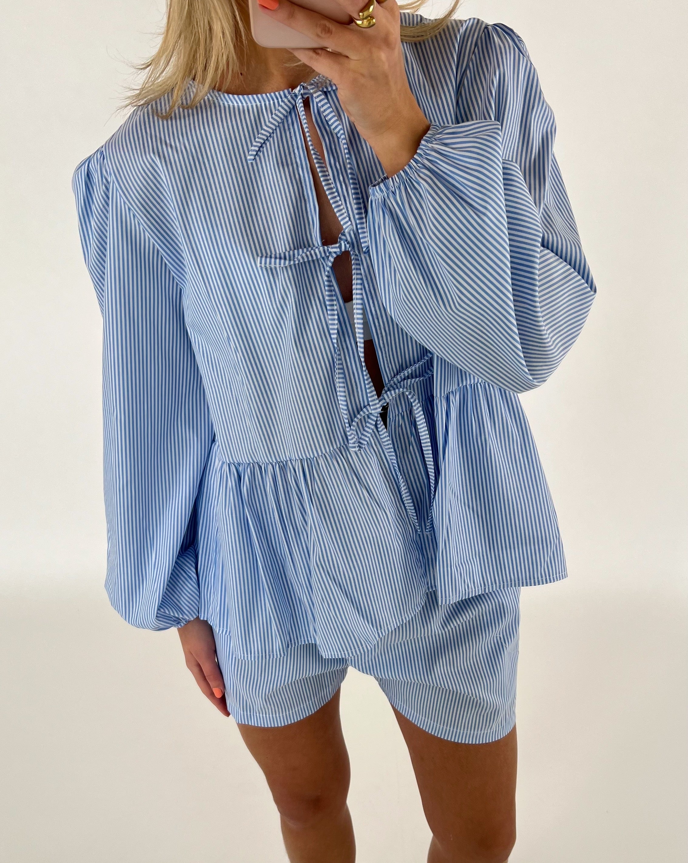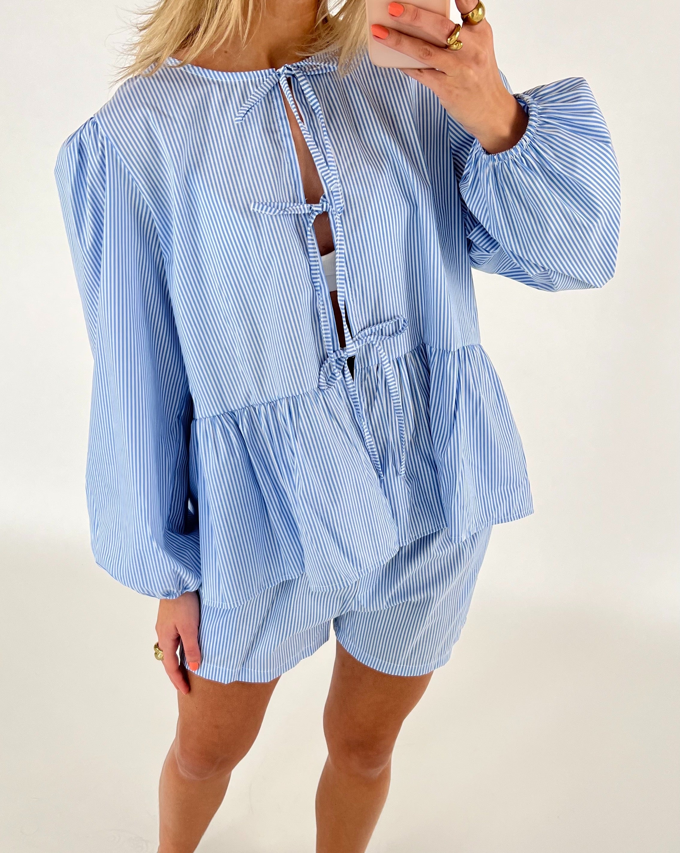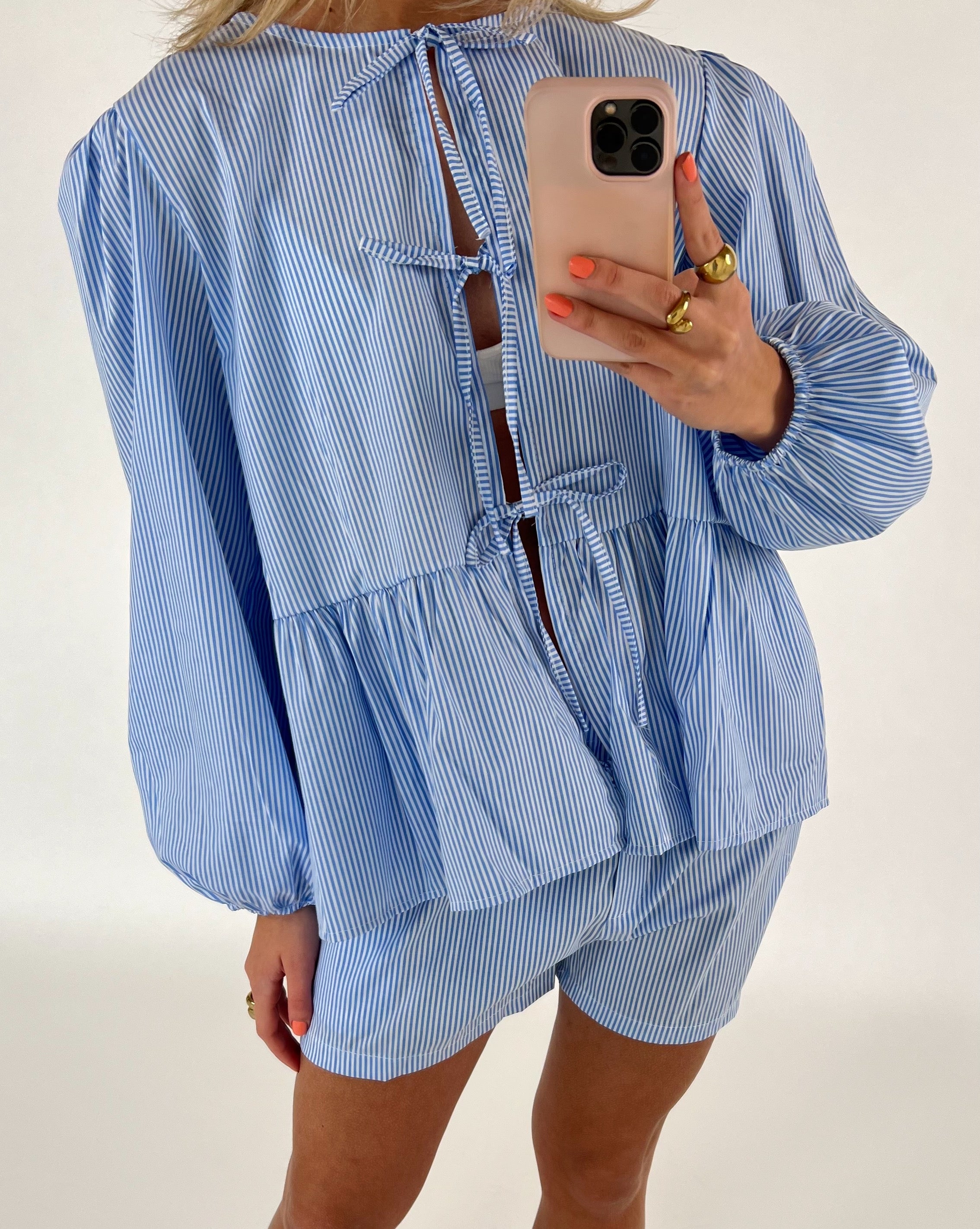 En person bærer en blå- og hvidstribet top med bånddetaljer og matchende shorts, mens de tager et spejlbillede med en mobiltelefon. Personen har lyse negle og bærer smykker.