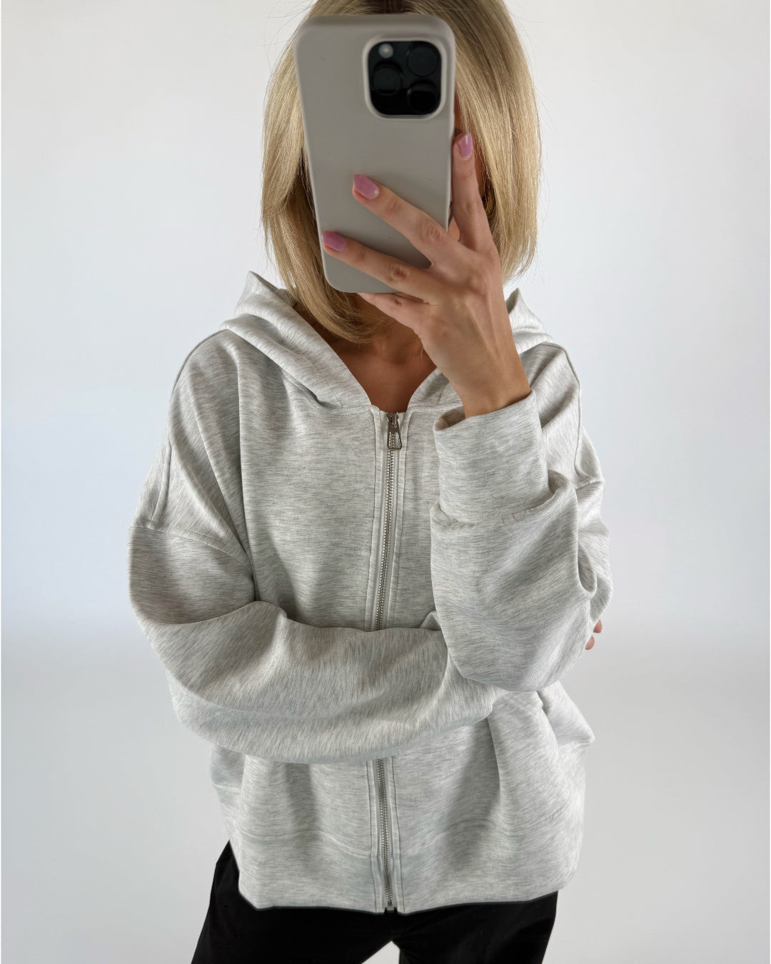 En person iført en grå hættetrøje og sorte bukser står i et lyst rum og tager et spejlbillede med en smartphone.
