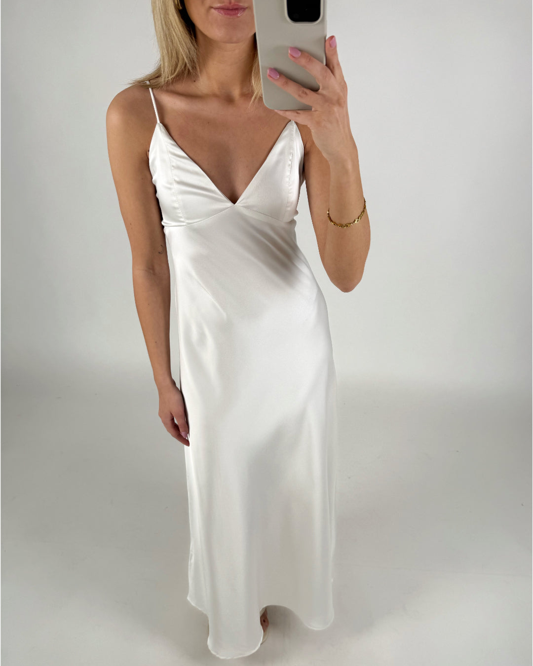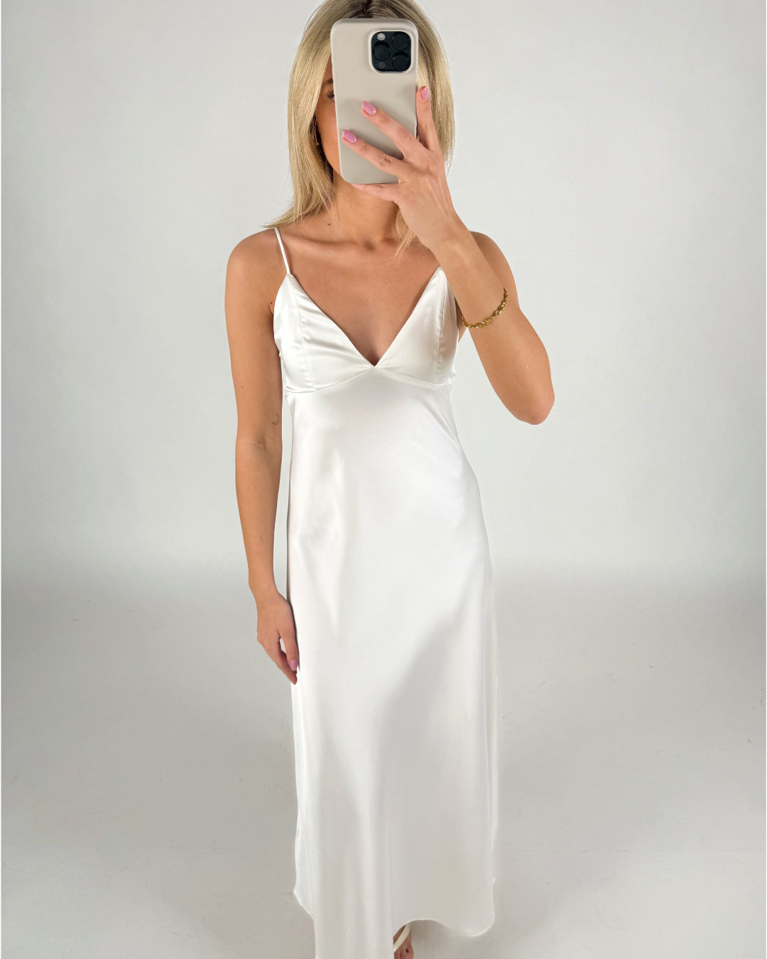 Den smukke AMINA kjole, hvid er en elegant maxi kjole, i satin lignende stof. Kjolen er en lang, sidder smukt på brystet og falder smukt, grundet det løse stof.