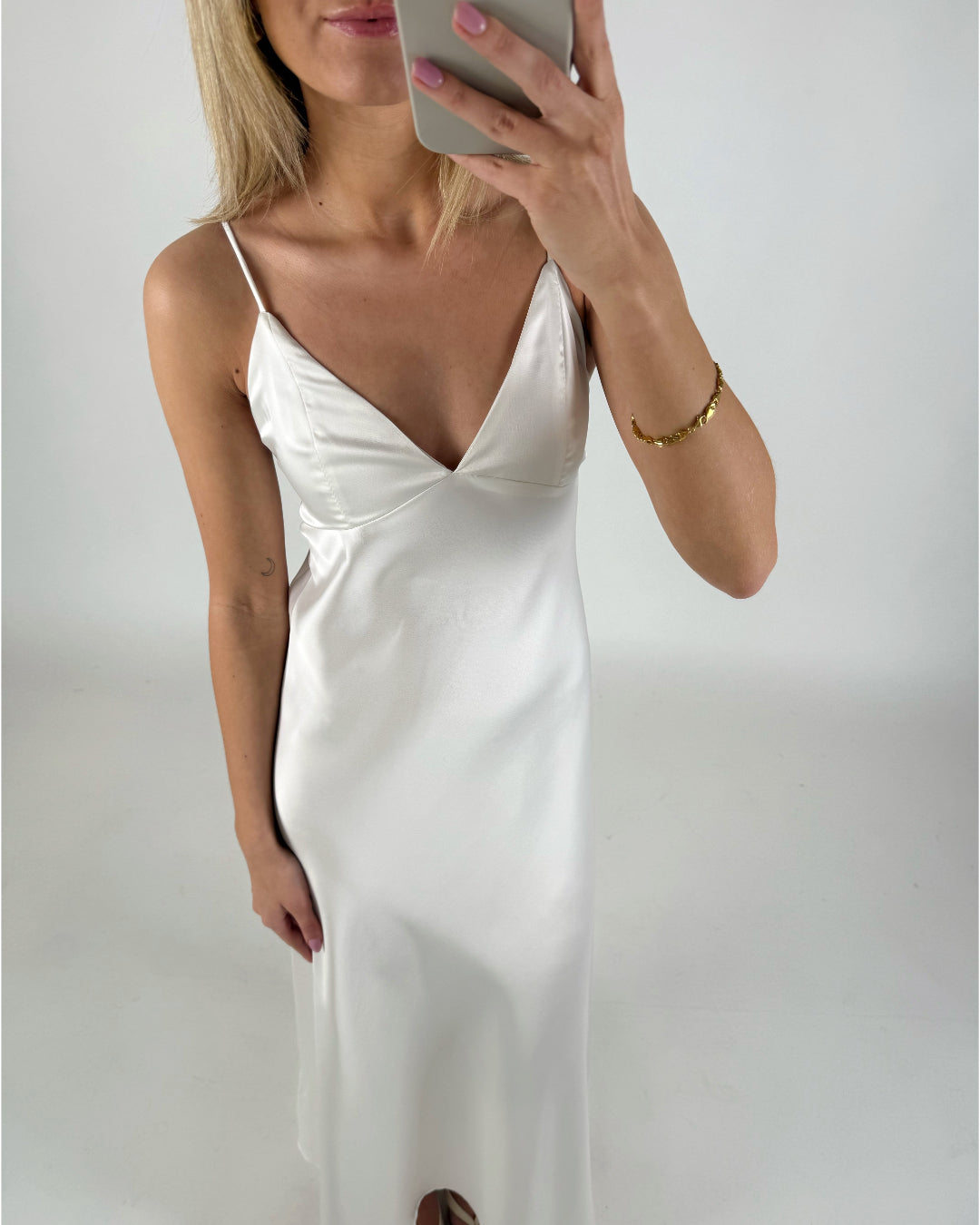 En person iført en lang, hvid kjole tager et spejlbillede. Personen holder en smartphone i et lyst rum, og kjolen har tynde stropper og en dyb udskæring.