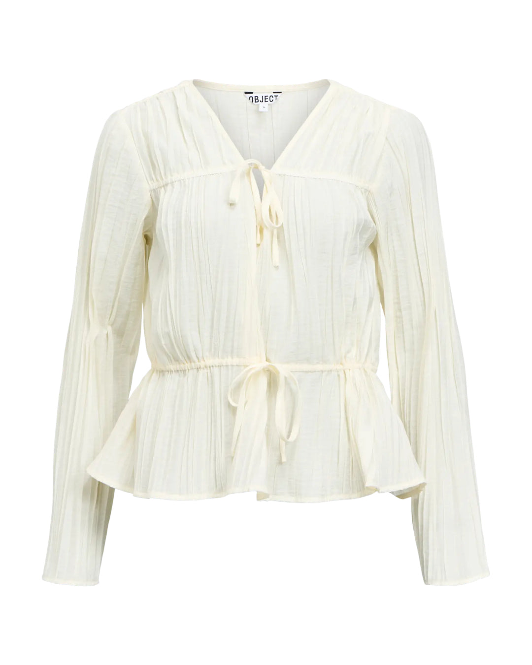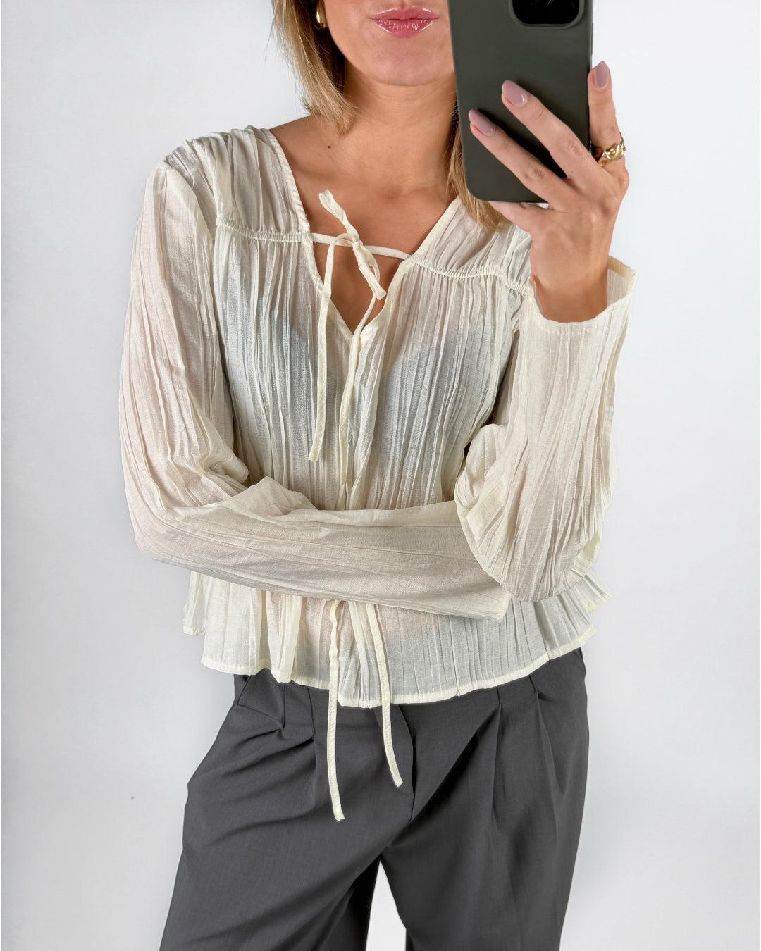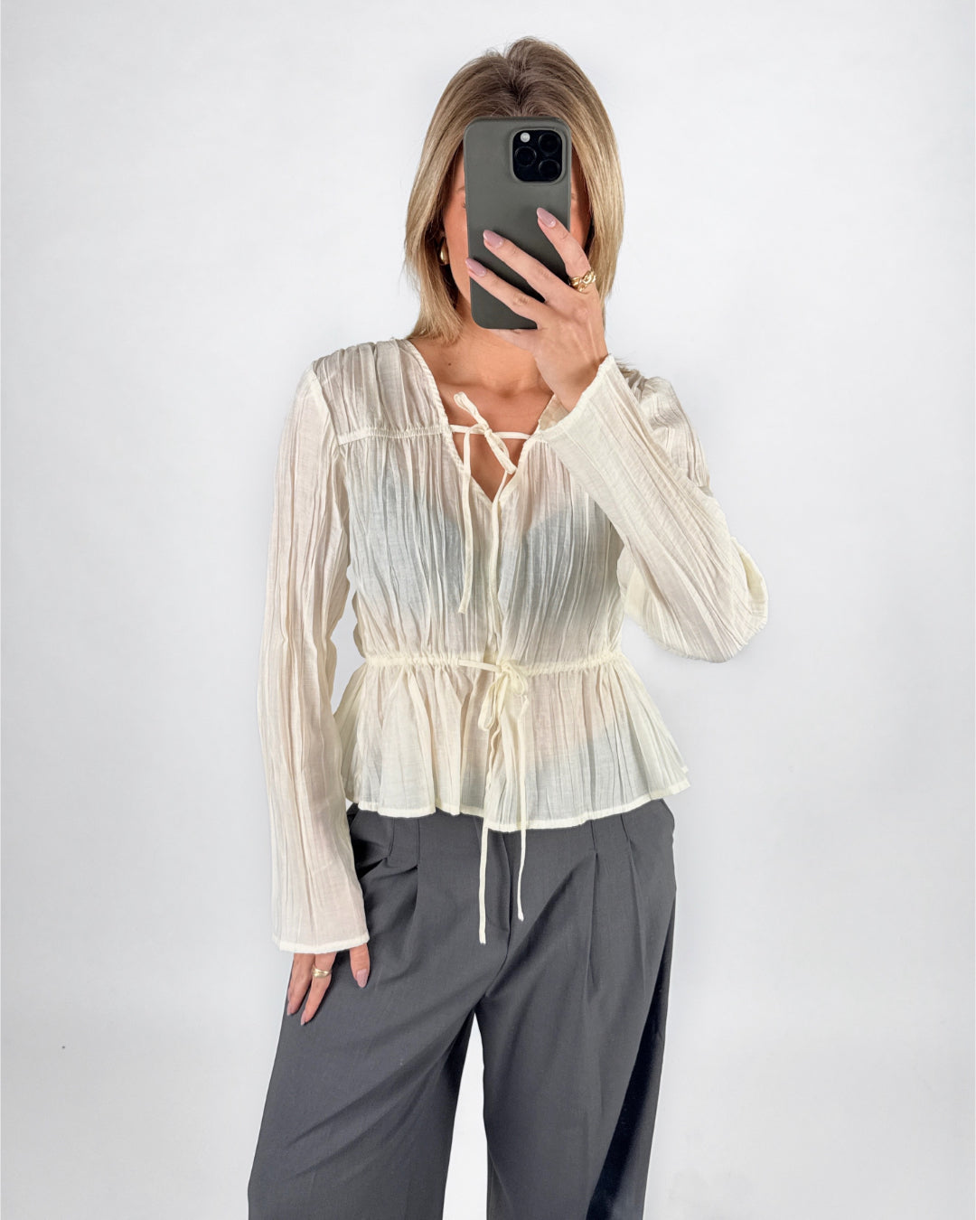 Vores BREA bluse, hvid er den fineste bluse med smukke detaljer. Blusen har detaljer med bindebånd, både i livet og ved brystet ved halsudskæring. Den falder fint og er let i materialet.
