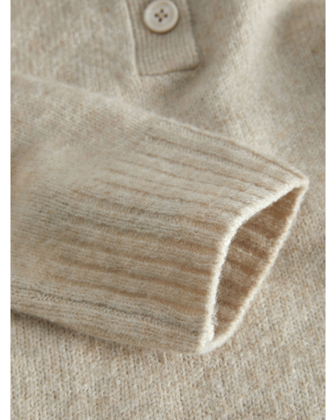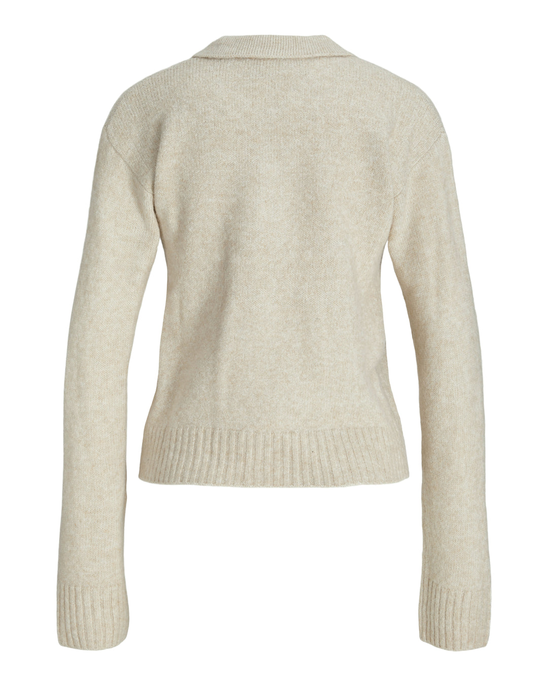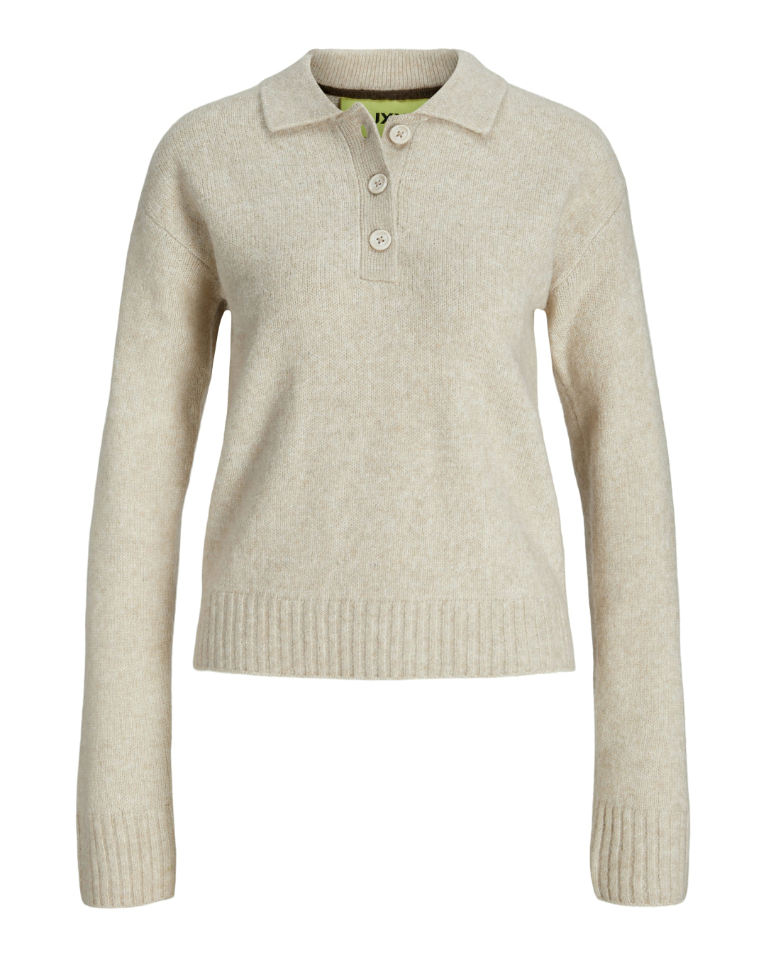 Vores CATALINA strik polo, beige er en langærmet glatstrikket polo, som har krave, 3 knapper og rib kant forneden.
