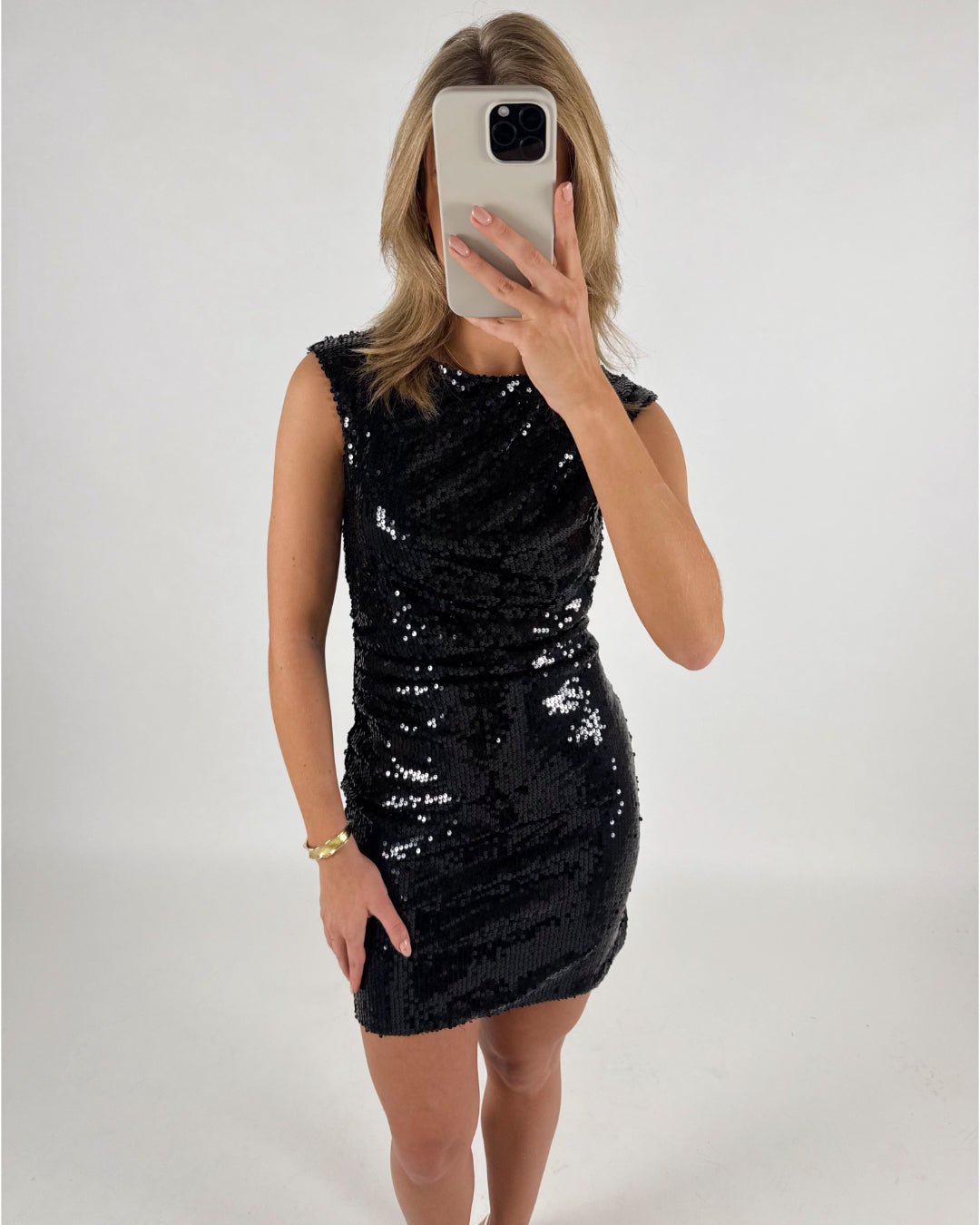 En person tager et selfie iført en sort palietkjole i et lyst rum. Personen har lyst hår og holder en telefon med begge hænder.
