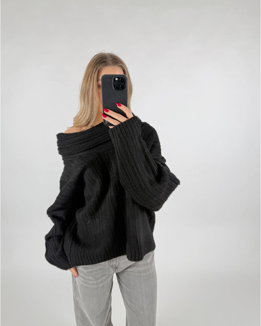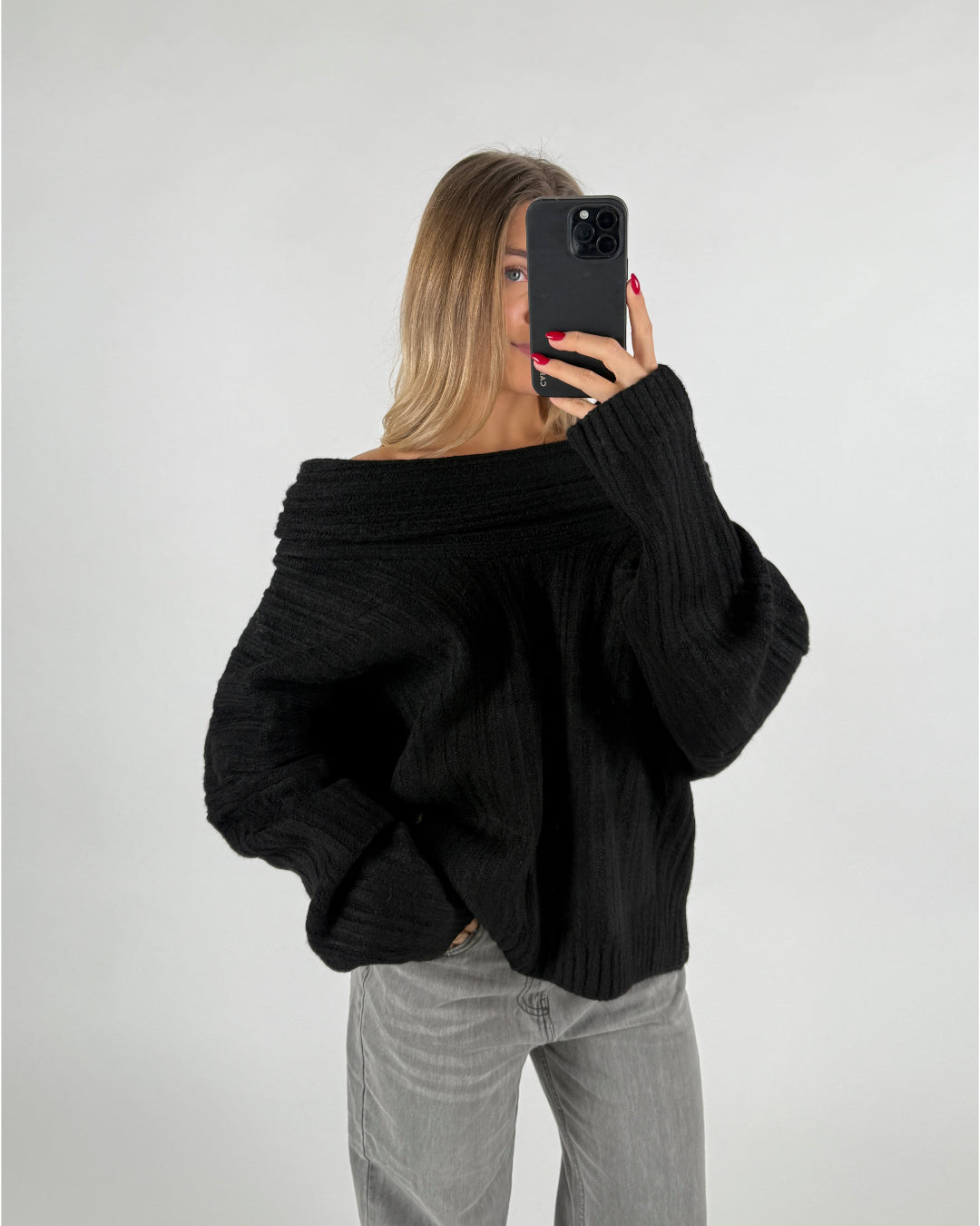 En person iført sort striktrøje tager et spejlbillede med en smartphone. Vedkommende har langt, lyst hår og rødmalede negle, omgivet af en neutral baggrund.