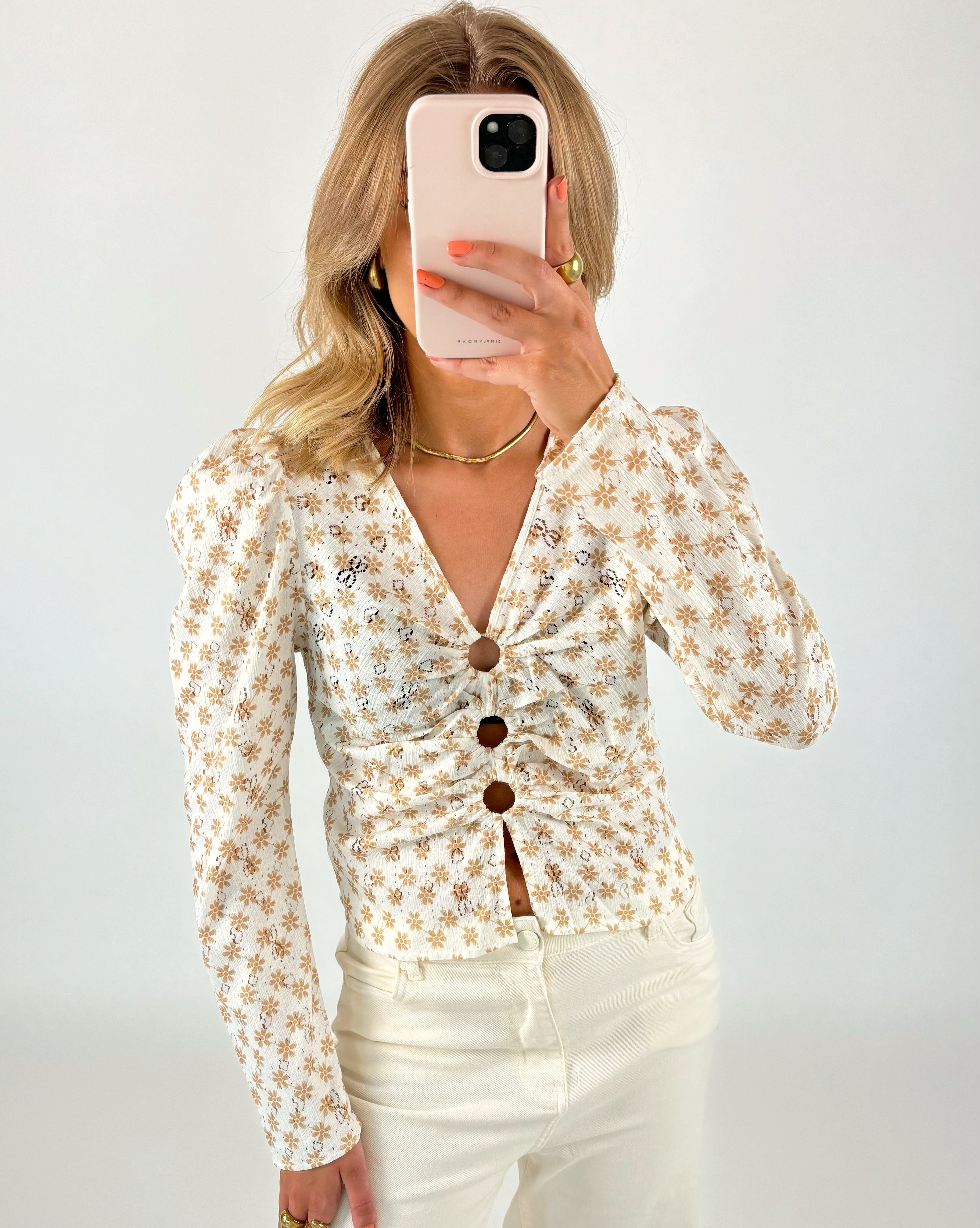 Blusen har mange smukke detaljer som v-udskæring, et mønstrede look, puf ved skulderen og 3 åbne ringe ned langs maven.