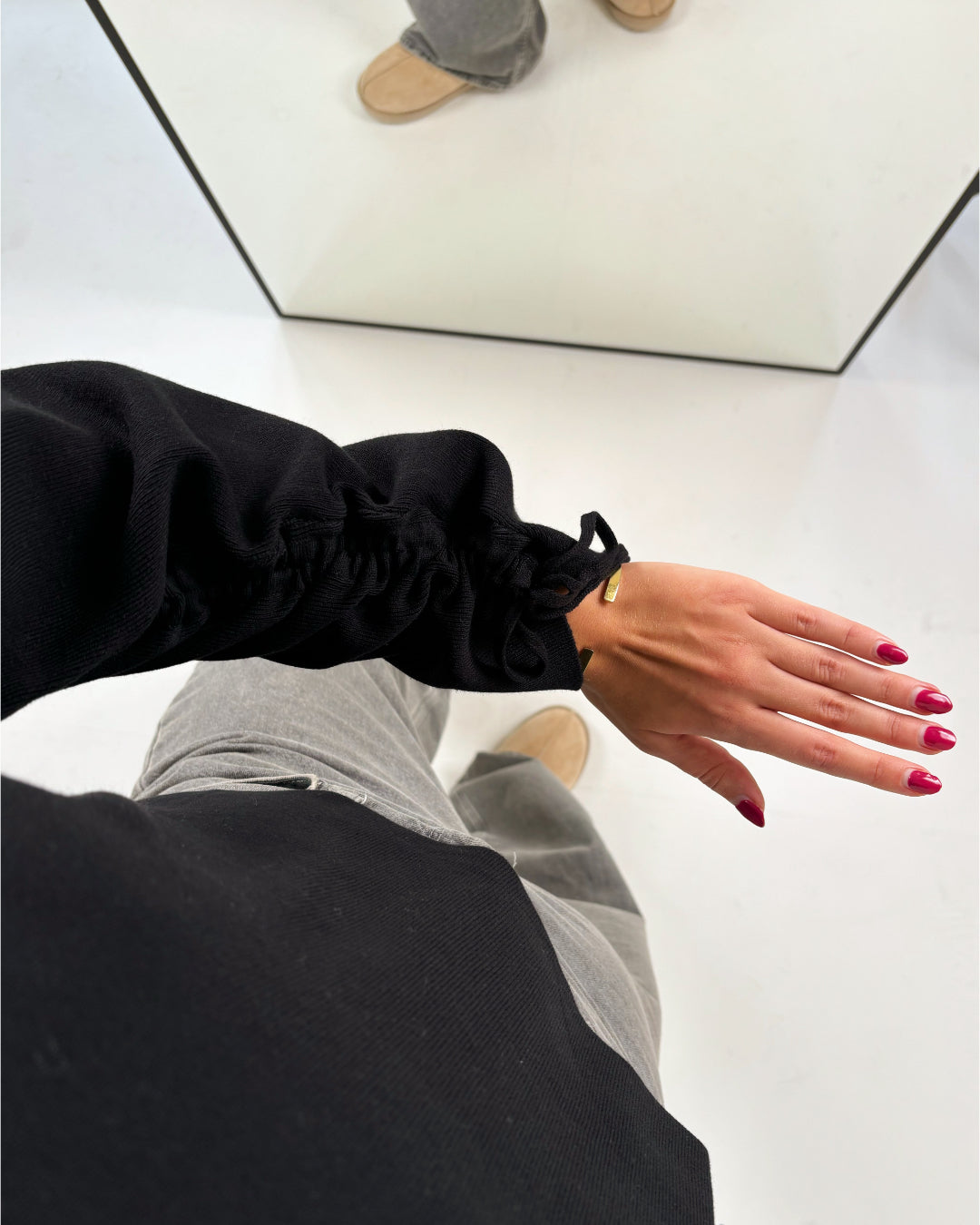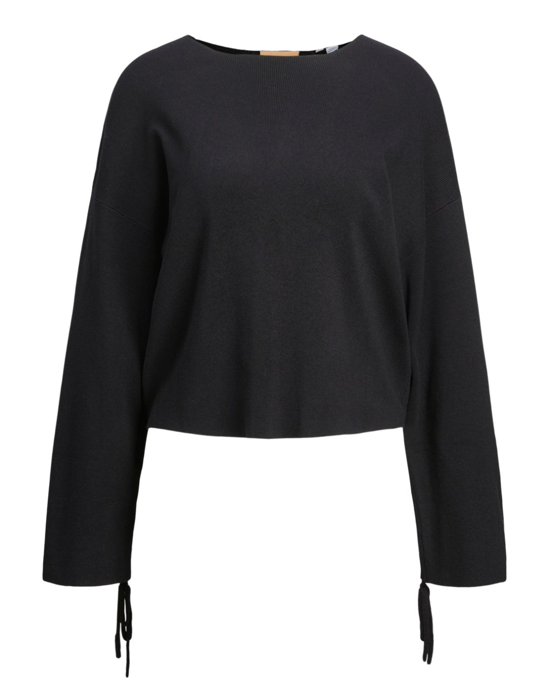 Vores DAHLIA strik, sort er en fin strik med vide ærmer som kan snøres op til et cool look (se billede 3). Strikken er en god basic, som passer perfekt ind i enhver garderobe.
