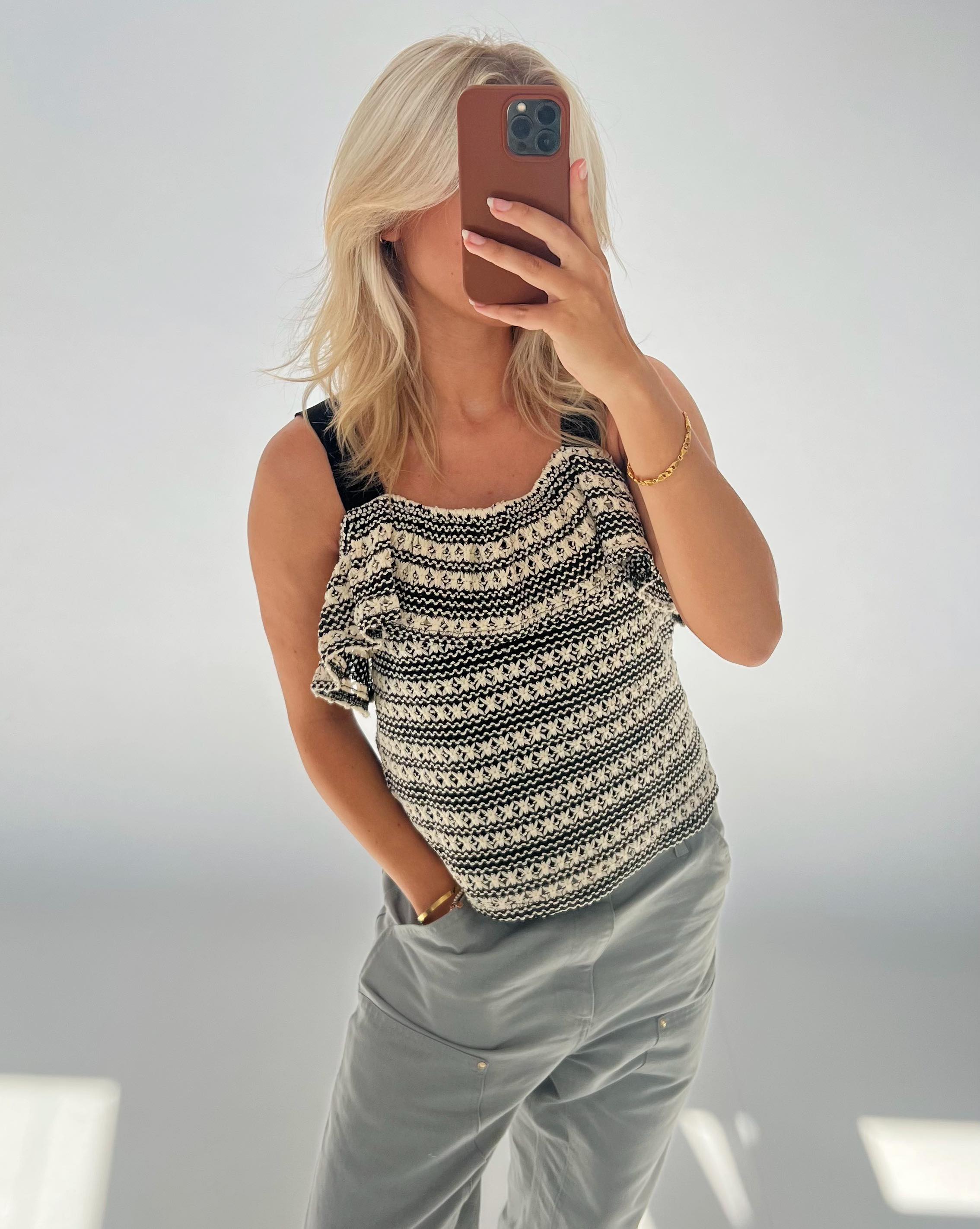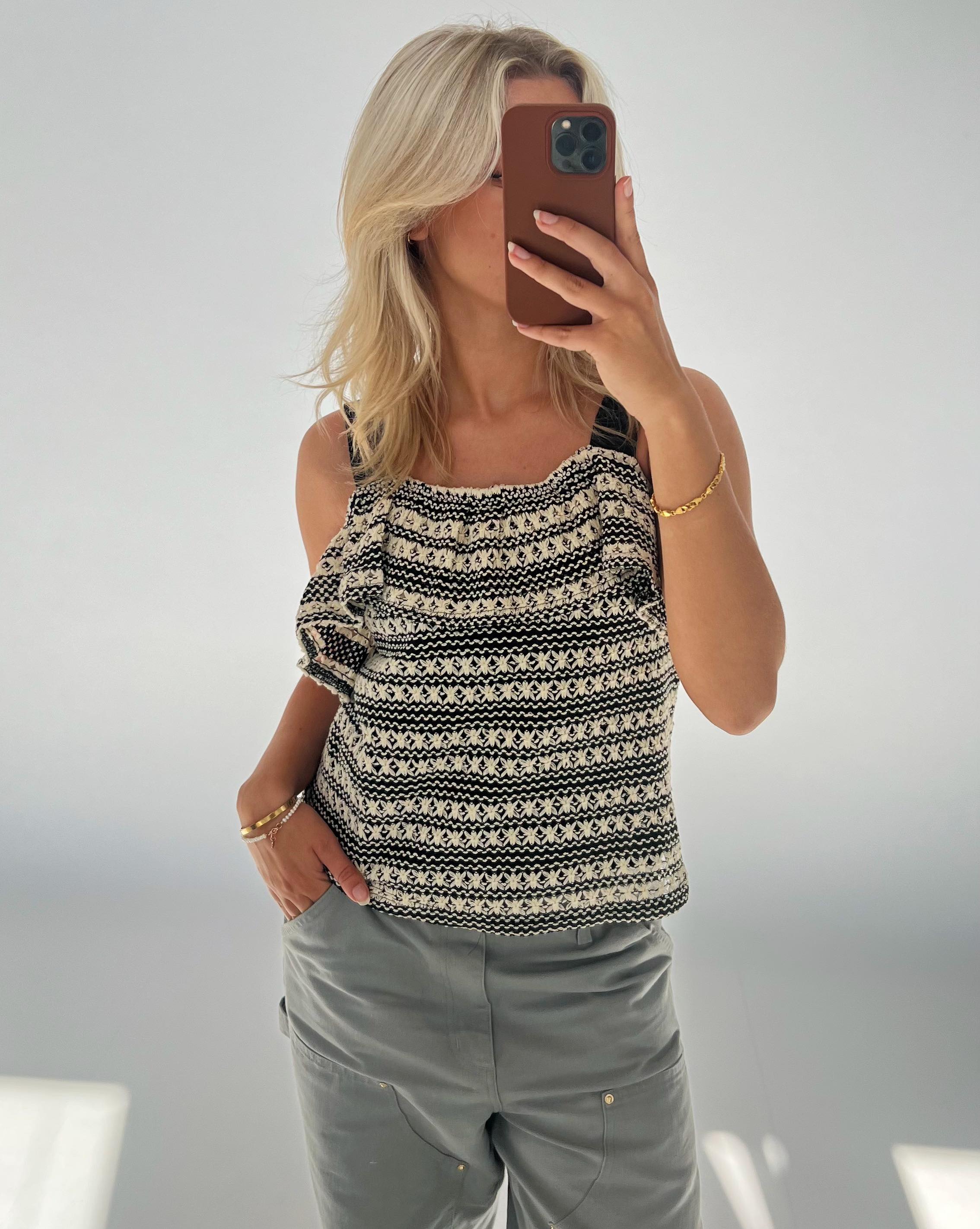Detaljerne på toppen tilføjer et subtilt strejf af stil og kan bruges til at skabe forskellige udtryk. Den sorte farve er klassisk og alsidig, hvilket gør denne strikkede top til et must-have i enhver garderobe.