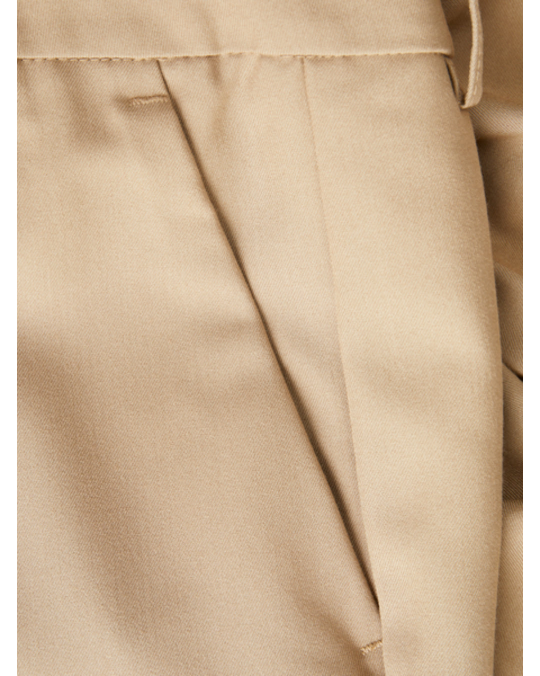 Beige stof med syninger og folder, der antyder detaljer som en søm eller lomme på en beklædningsgenstand, i en nærbillededetalje uden synlig tekst.