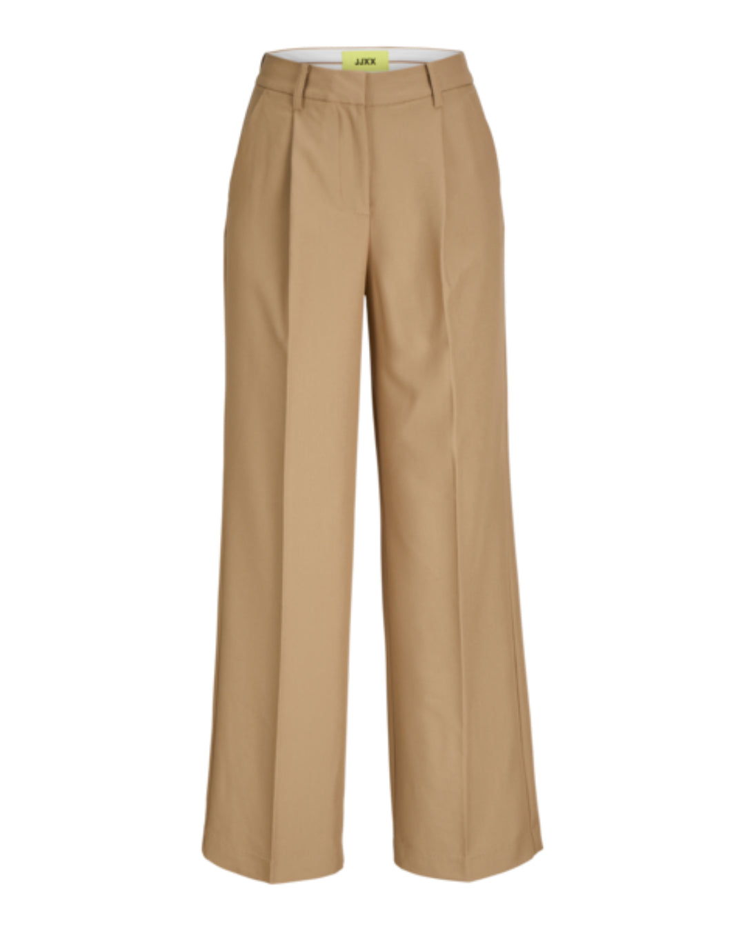 Bukser i beige farve, hænger frit, med lige ben og læg ved taljen, på neutral baggrund. Indvendigt mærke med teksten "JJXX".