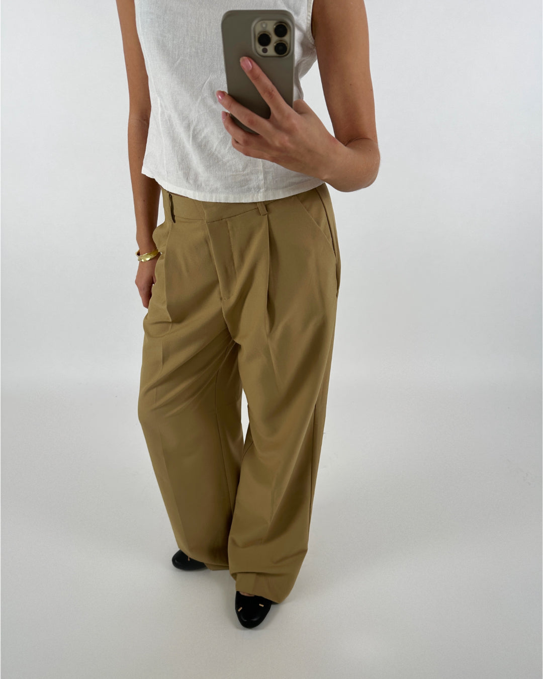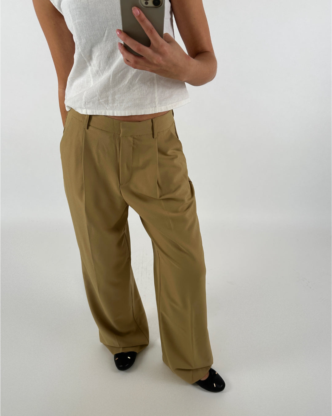 Person iført hvid top og beige bukser, tager et spejl-selfie med en smartphone. Baggrunden er hvid og minimalistisk. Personen har sorte sko på.