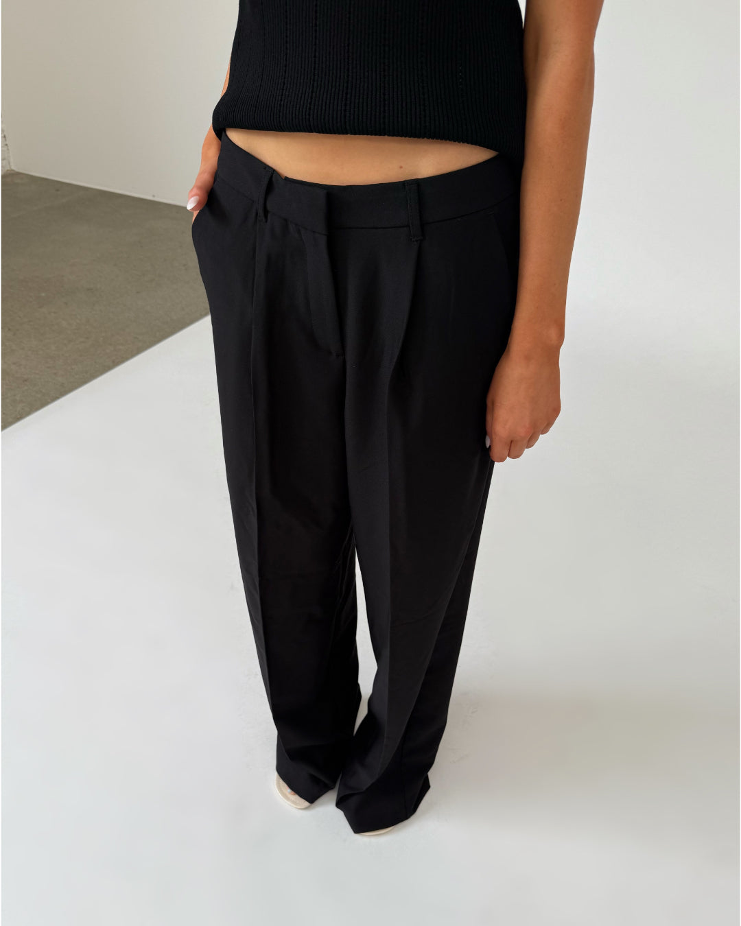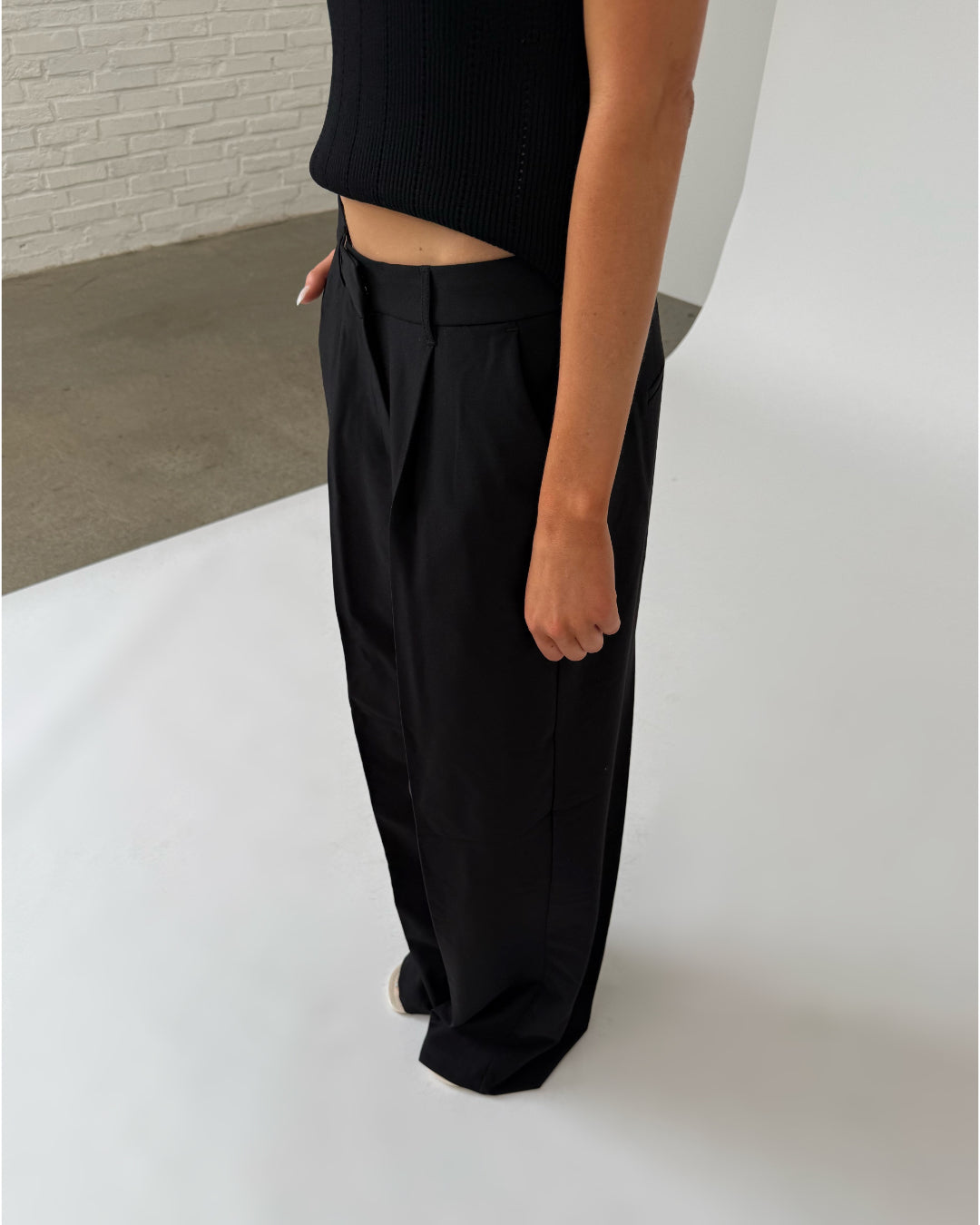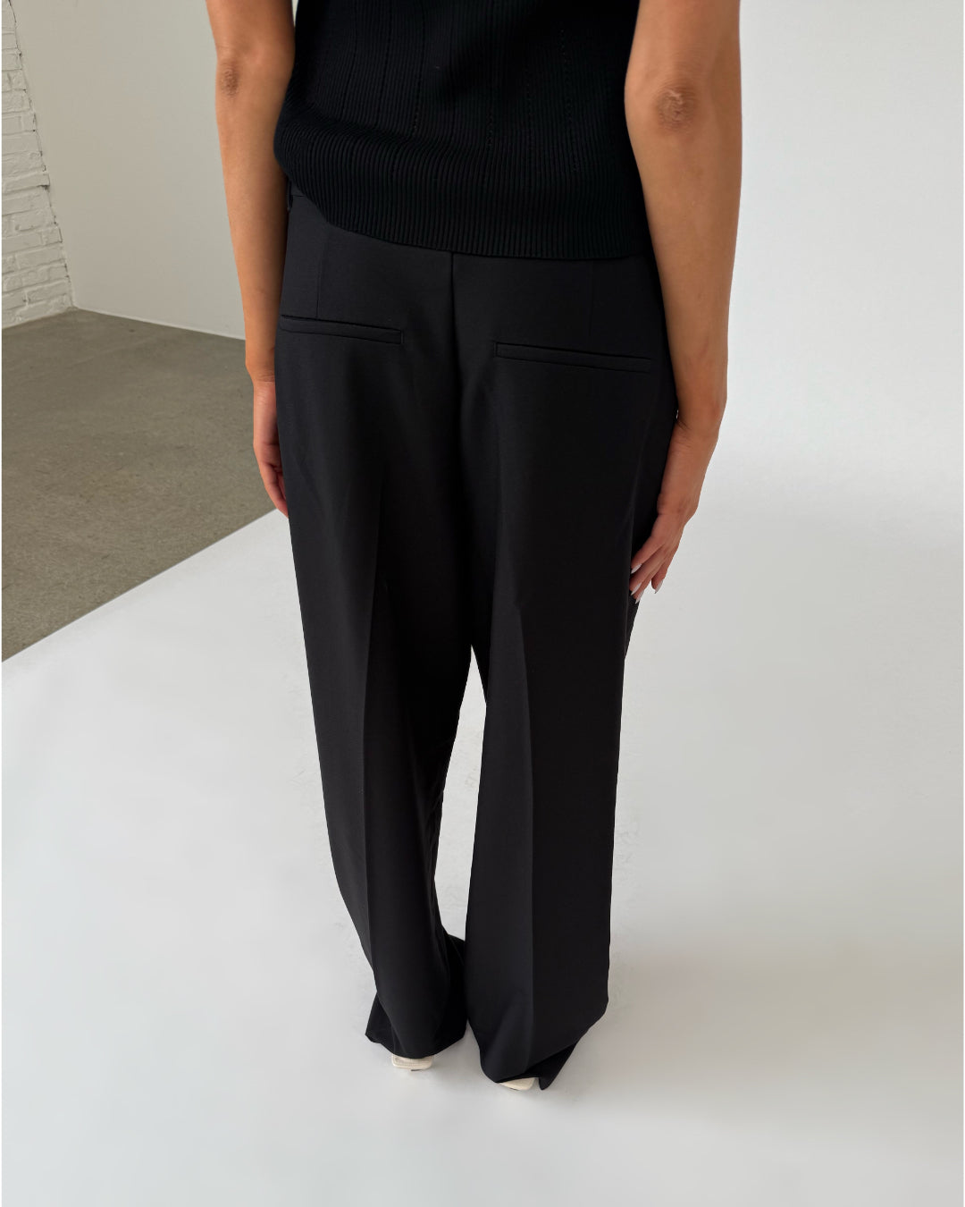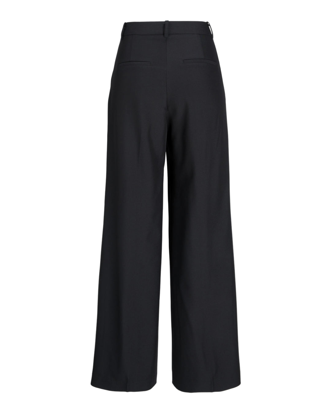 Bukser i sort stof, hænger uden aktivitet, mod en neutral, hvid baggrund. Stilren design med brede ben og en synlig lynlås.