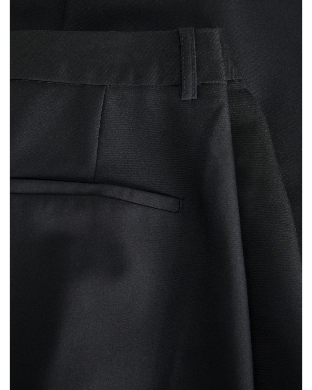 Bukser i sort stof ligger fladt. En baglomme er synlig med en bæltestrop over. Stoffet er glat og skinnende i en neutral opsætning.