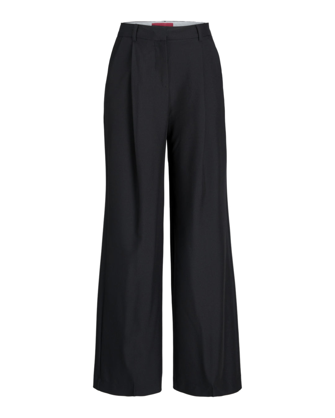 Sort bukser hænger stille mod en ensfarvet baggrund, med brede ben og høj talje, uden synlige dekorationer eller tekst på stoffet.