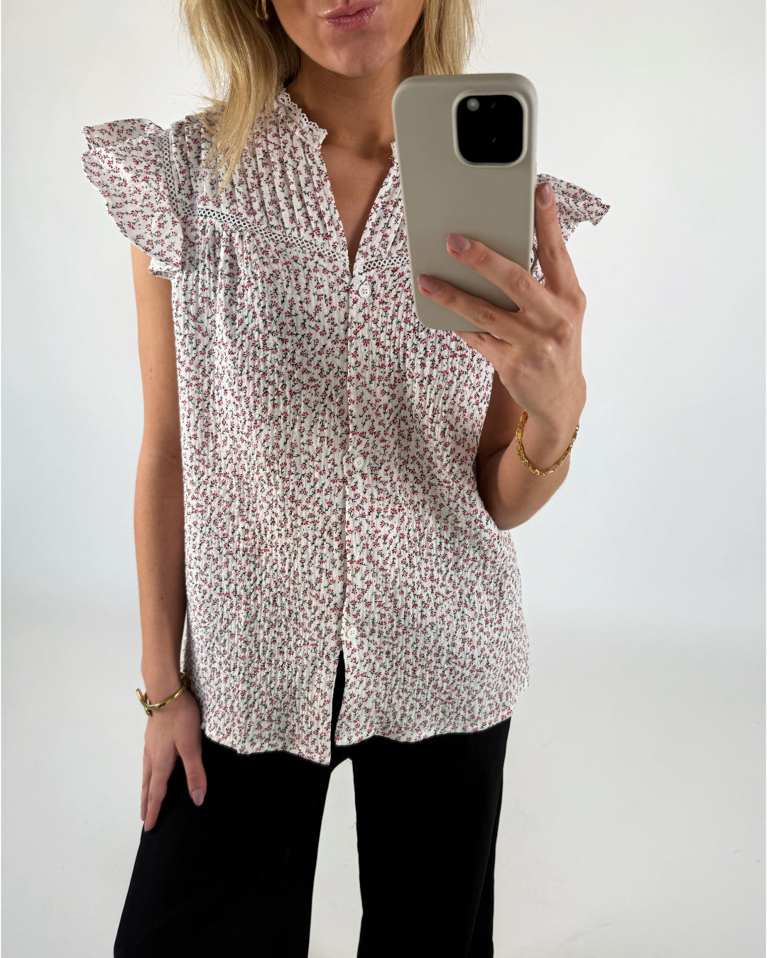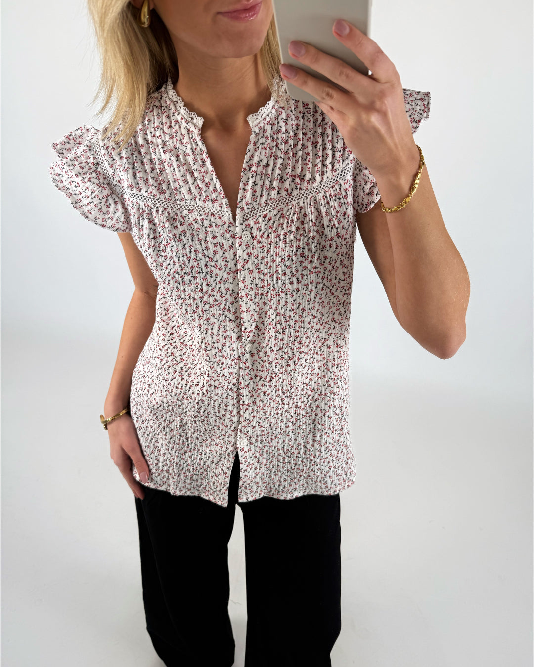 EMILIA top, hvid er den sødeste forårs- og sommertop. Toppen har fine detaljer, som er med til at skabe et elegant udtryk. EMILIA top, hvid har knapper langs fronten og V-hals. Den er med fine små blomster