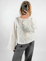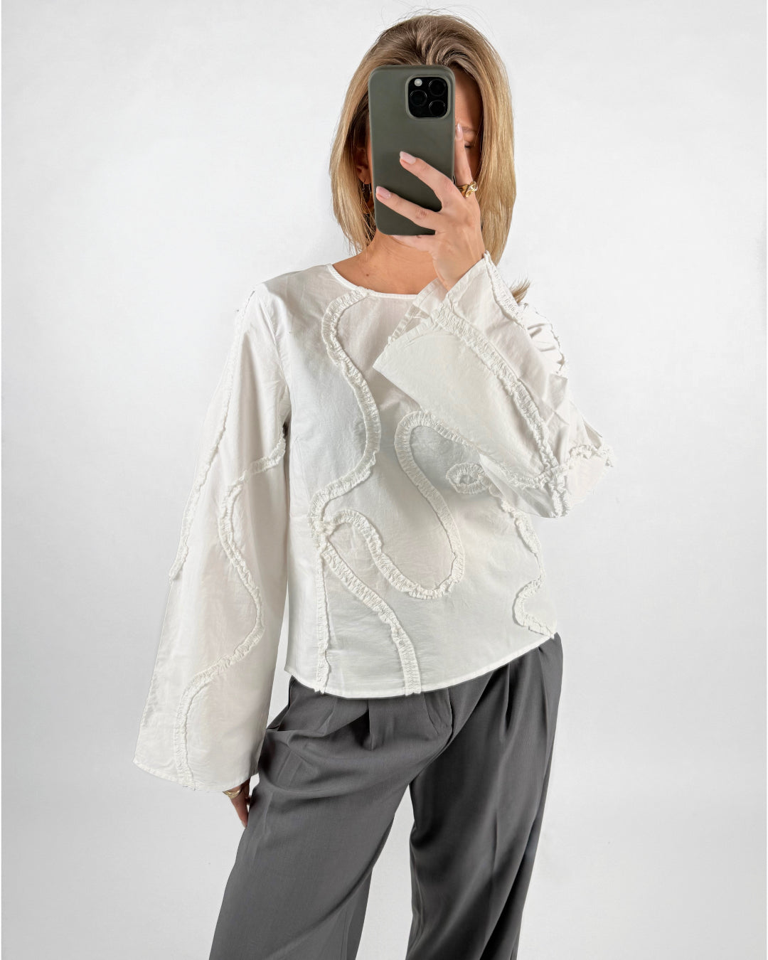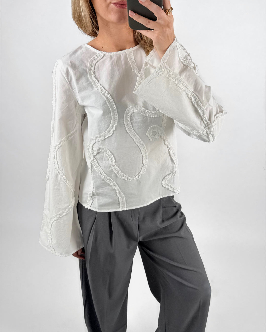 Vores smukke ENESA bluse, hvid er er så fin og enkelt, dog med fine patch detaljer på forside og ærmer. Blusem har rund hals og har knaplukning i nakken, hvilket giver en smuk talje.