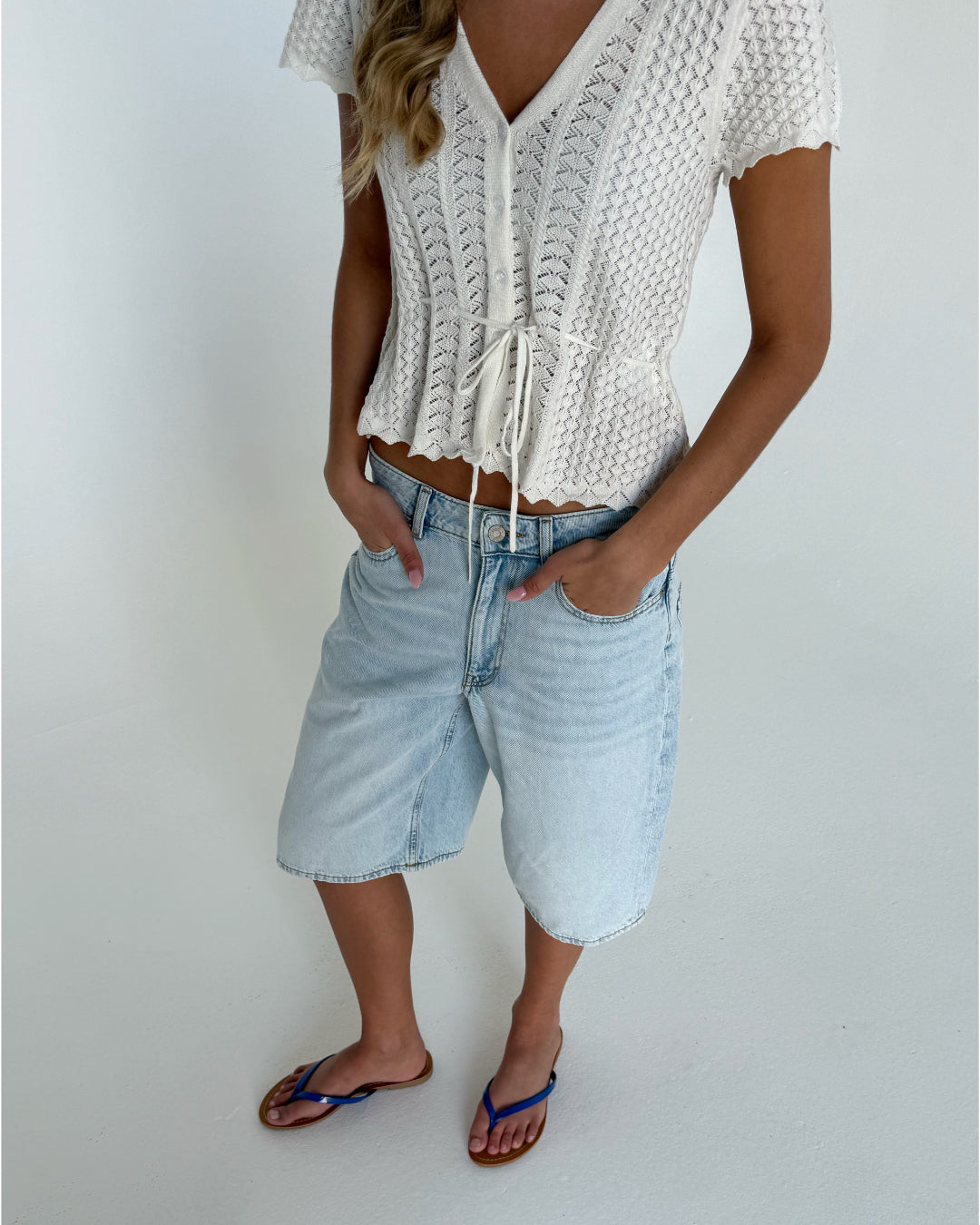 En person bærer en hvid strikbluse og lyse denimshorts, stående afslappet med hænderne i lommerne, iført blå klipklapper på en ensfarvet hvid baggrund.