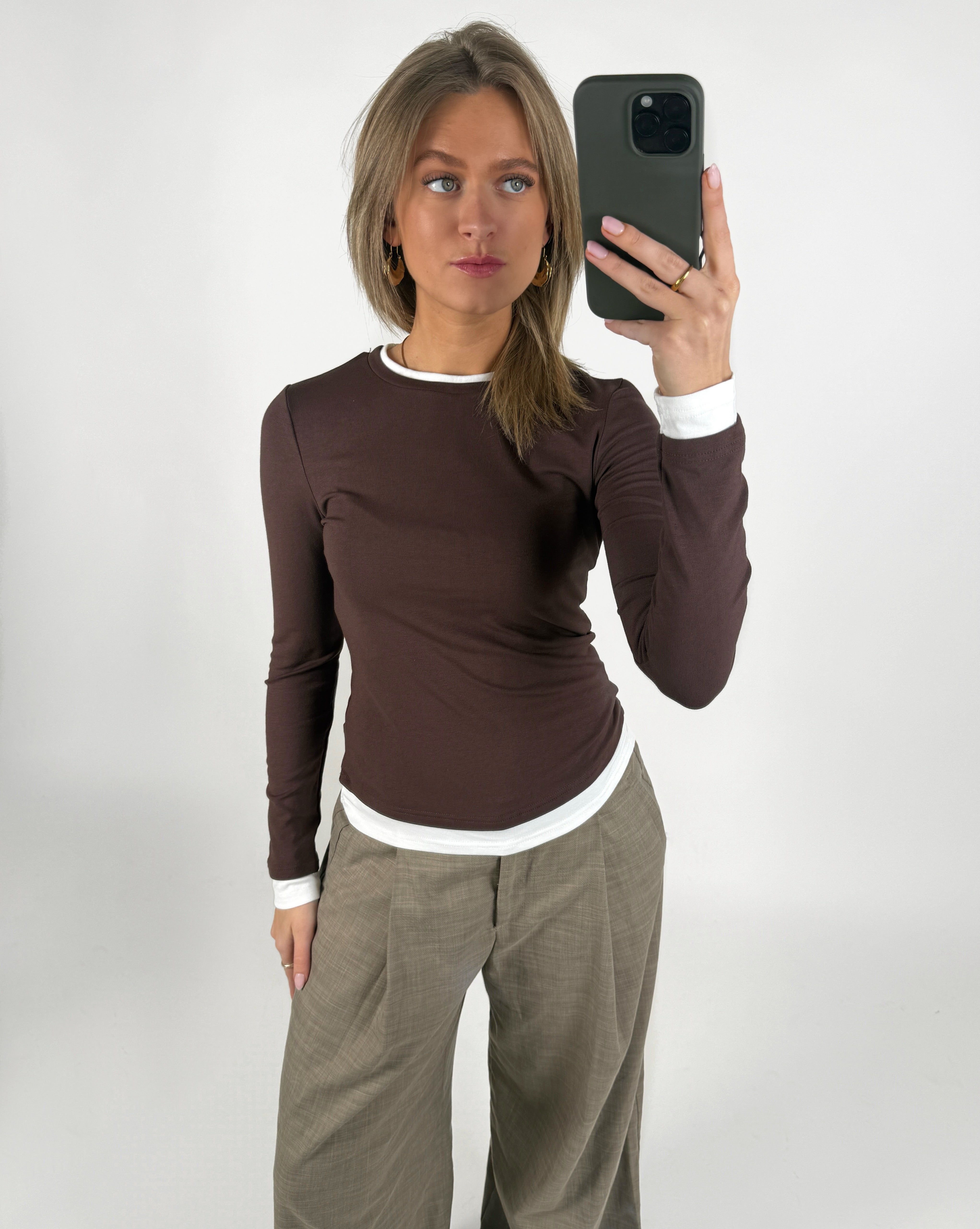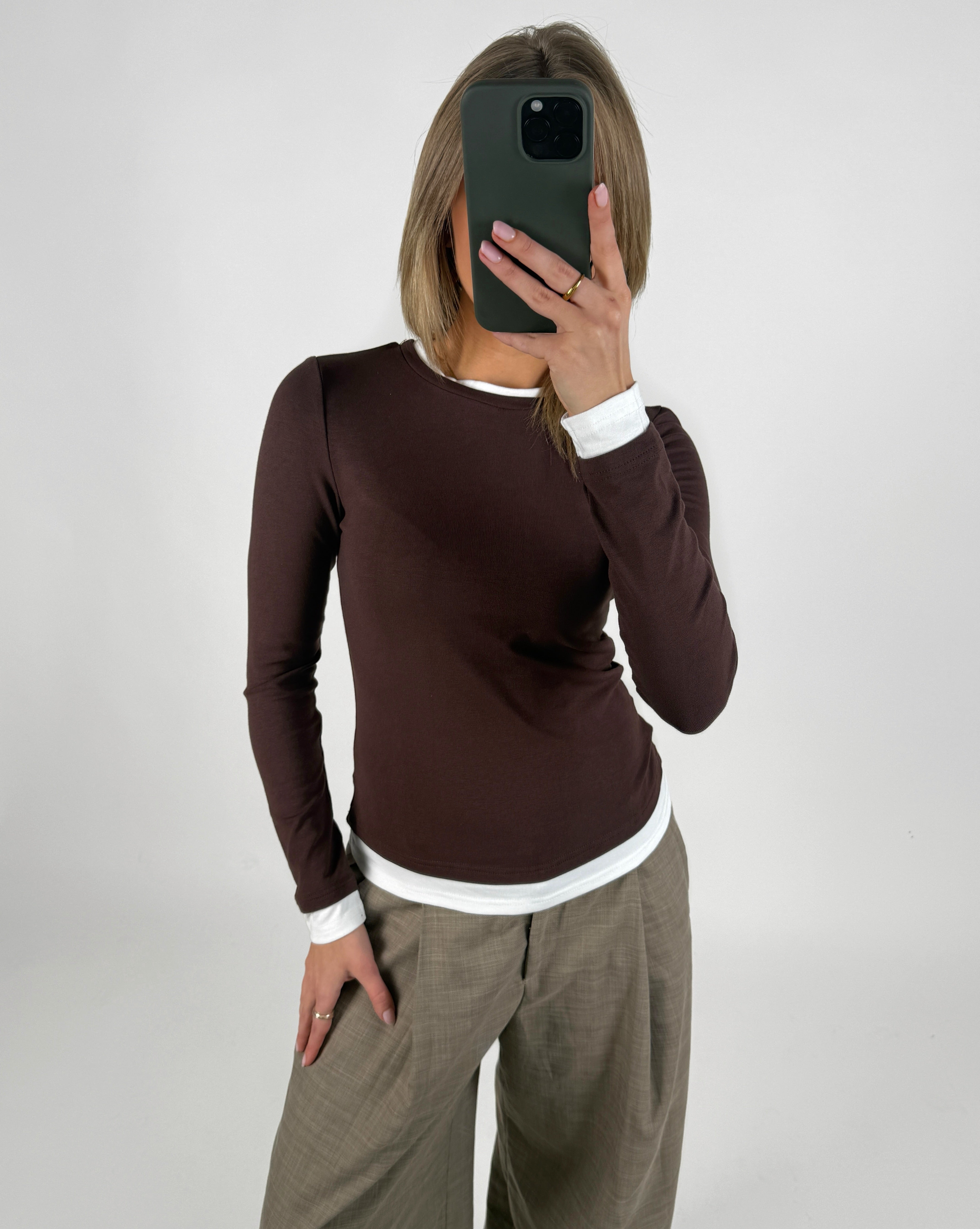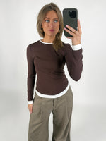 Den smukke EVIE langærmet, brun er den perfekte tætsiddende langærmede t-shirt. T-shirten har det cool dobbelt t-shirt look, da det ligner der er en trøje inde under.