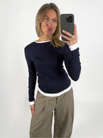 Den smukke EVIE langærmet, navy er den perfekte tætsiddende langærmede t-shirt. T-shirten har det cool dobbelt t-shirt look, da det ligner der er en trøje inde under.