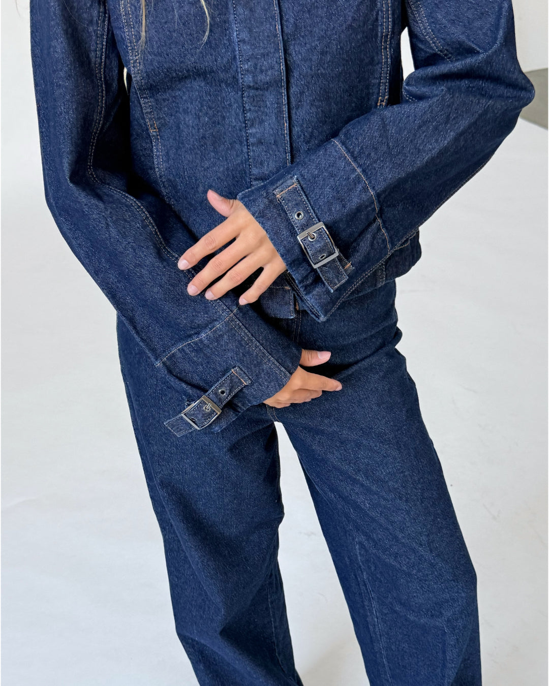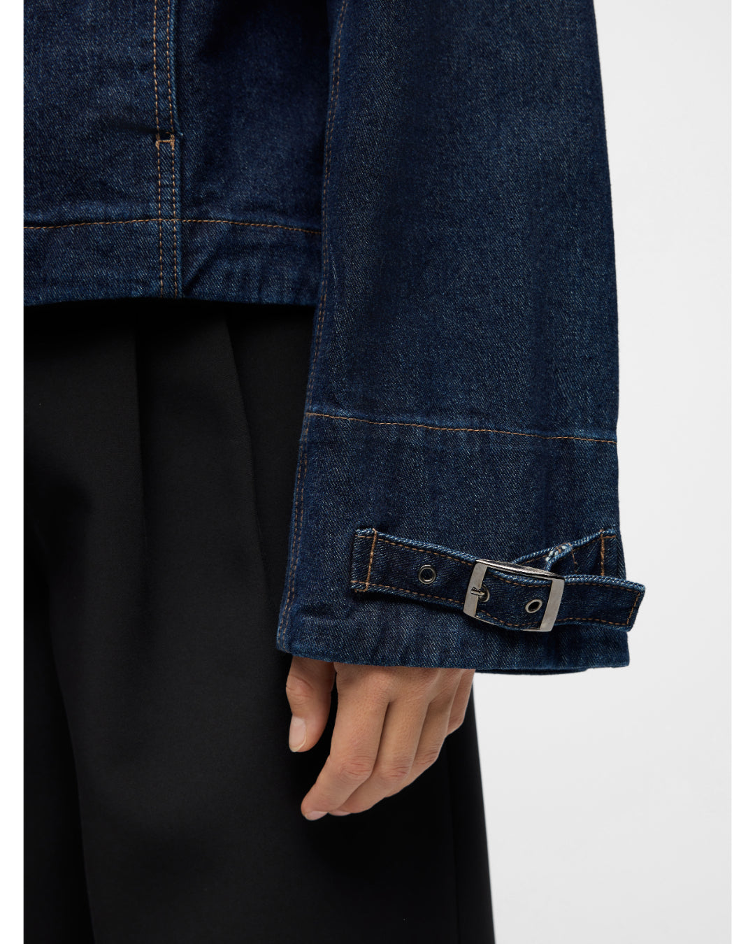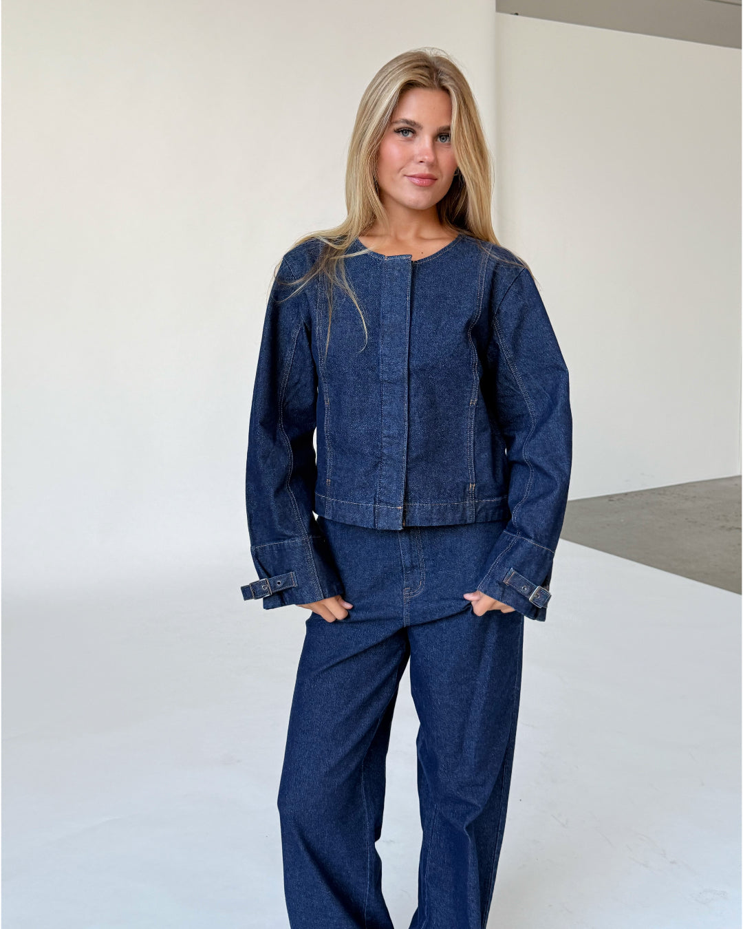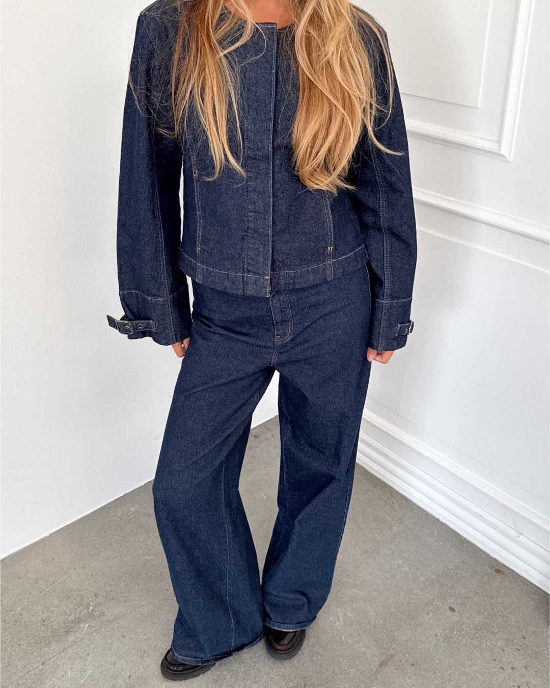 - Mørkeblå denim jakke.