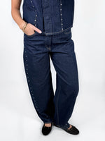 Detaljebillede af blå FUJI jeans med nitte detaljer. Barrel formet design. Fra BySofieSønderby