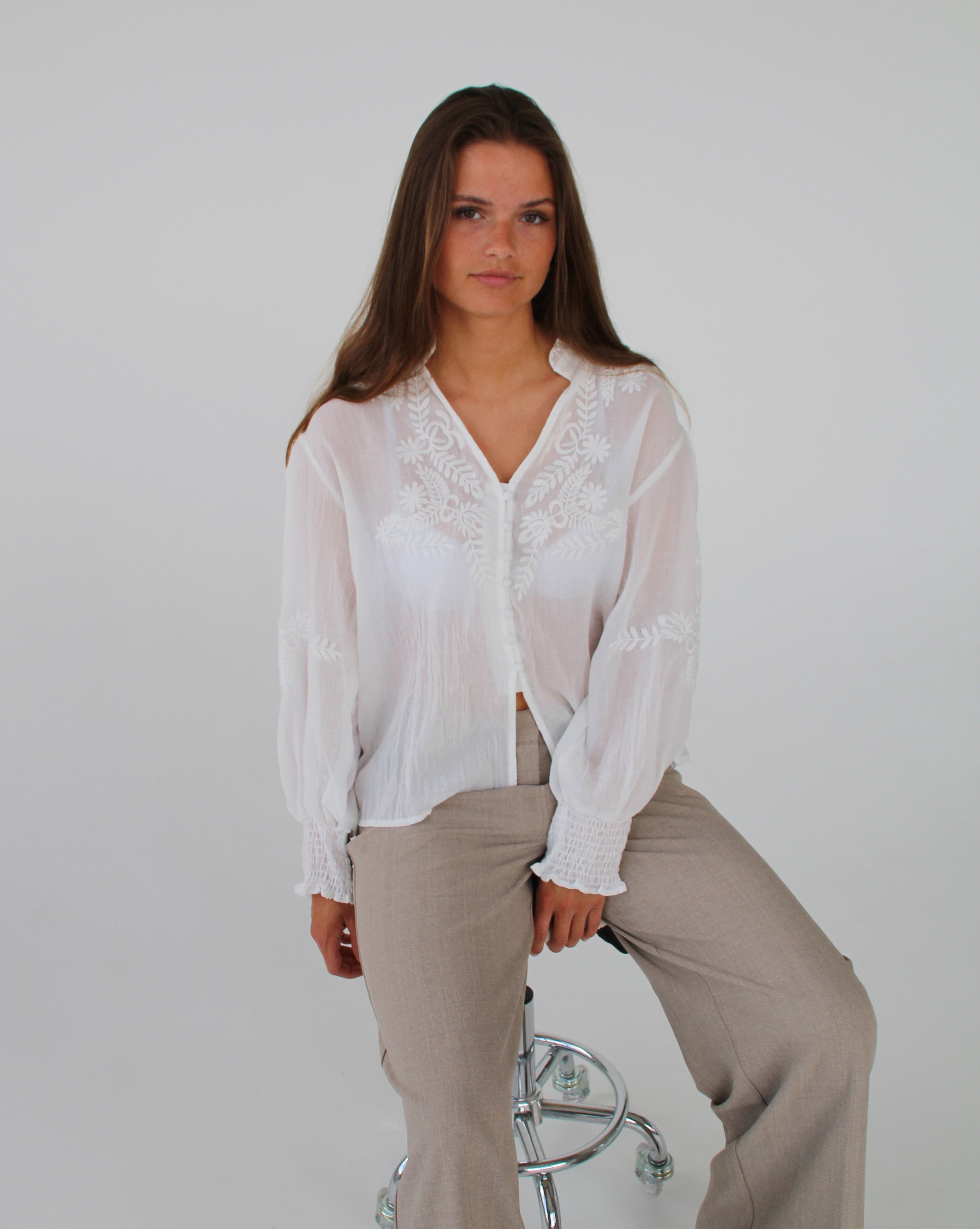 Den smukke ILYA skjorte, hvid har smukke blomster detaljer på stoffet, og er med smukke ballonærmer. Skjorten passer perfekt i en hver garderobe.