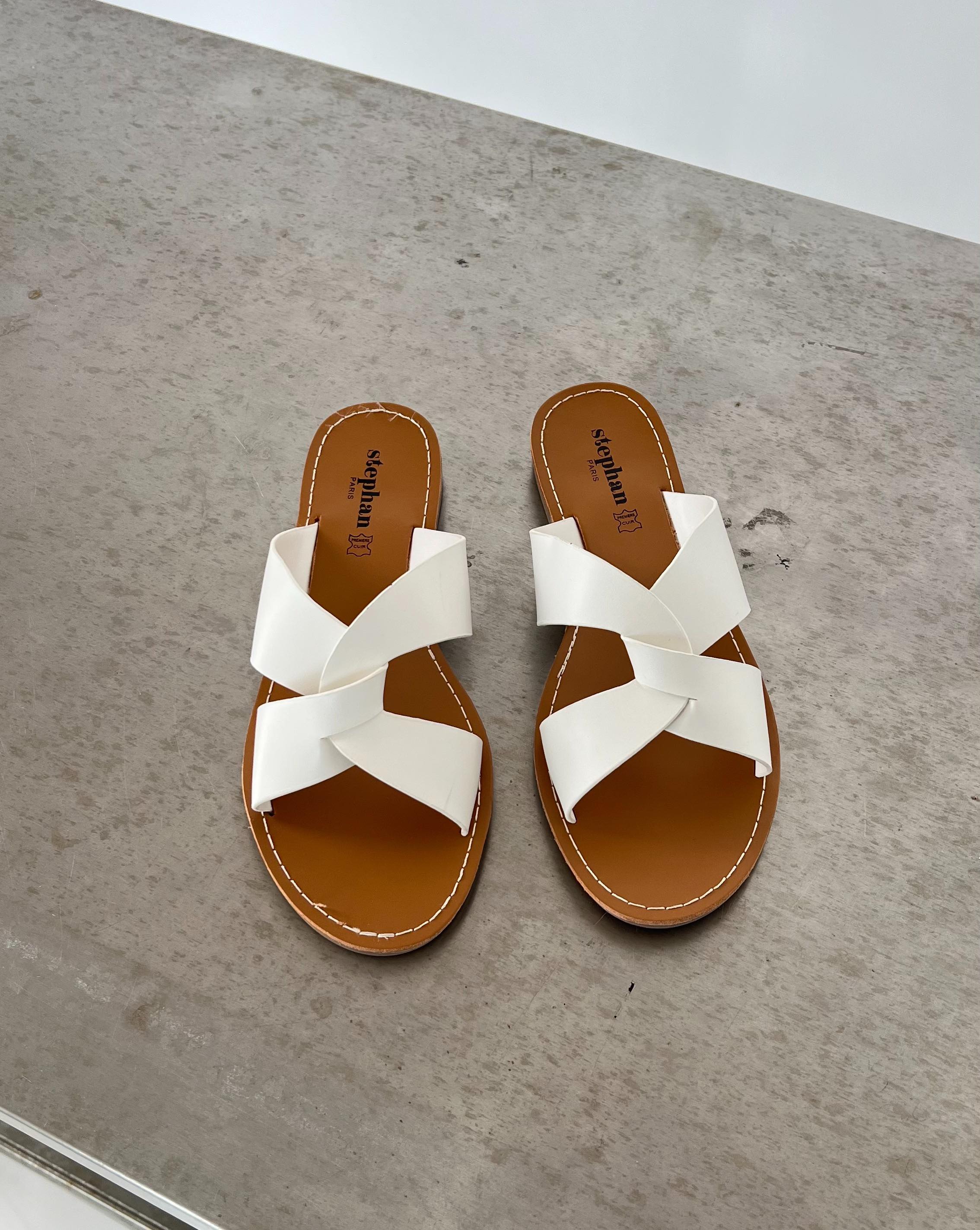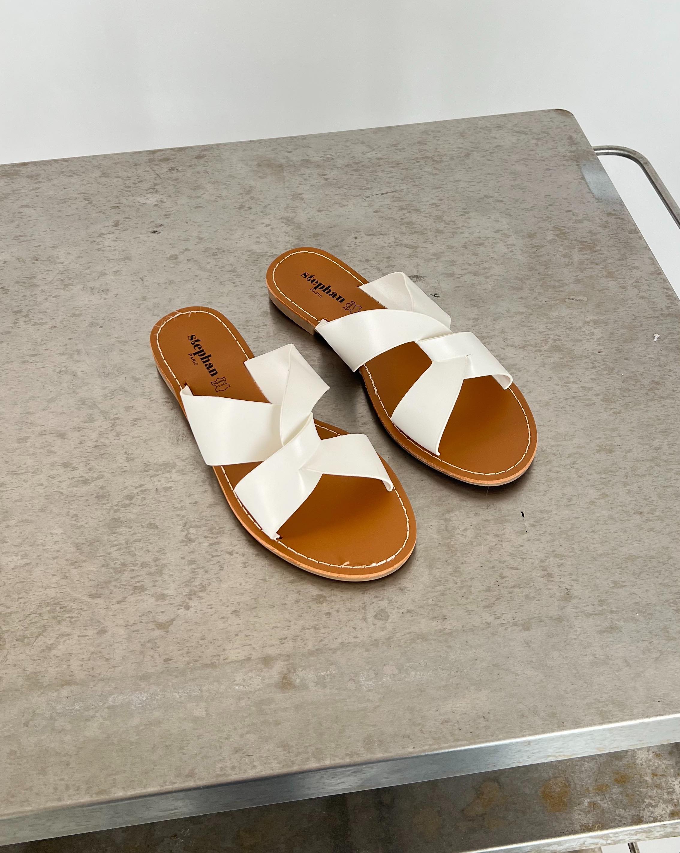 Sandaler med hvide krydsremme ligger stille på en grå, tekstureret overflade. Sandalens sål er brun med mærketeksten "stephan" synlig indeni.